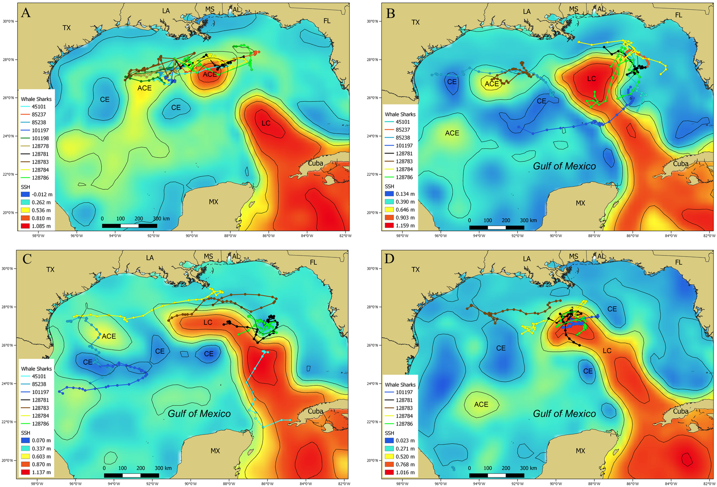 Maps depicting sea surface height (m) showing the Loop Current and warm core and cold core eddies in the Gulf of Mexico with whale shark, Rhincodon typus, most probable track locations overlaid during (A) July 2014, (B) September 2014, (C) October 2014, and (D) February 2015. Most of the locations from multiple individuals are associated with the Loop Current or other warm core eddies. Contour lines (black lines) are depicted at 0.2 m height increments. The Loop Current (LC), anti-cyclonic eddies (ACE), and cyclonic eddies (CE) are indicated on the map.