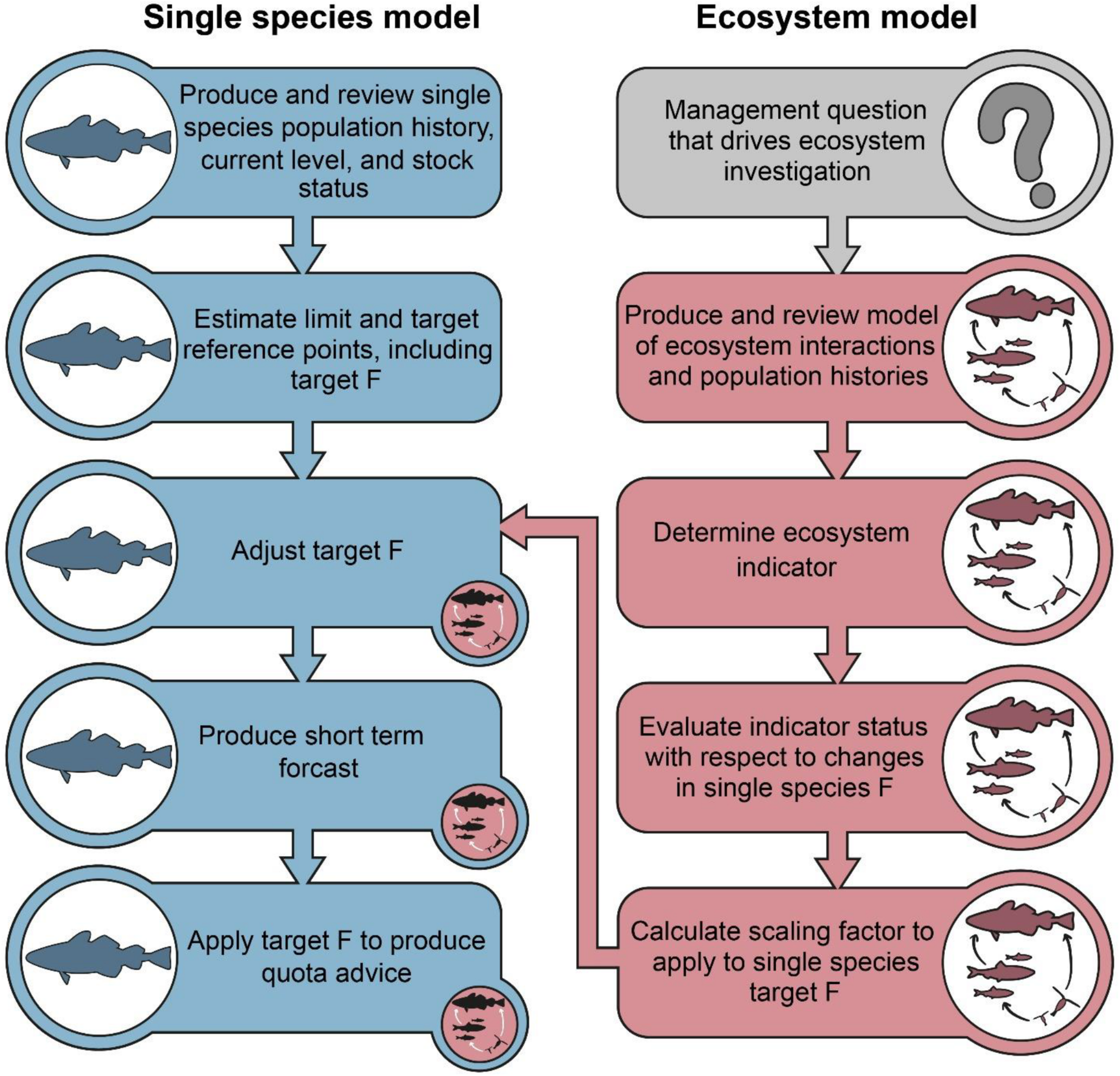 Figure 1. Flow chart outlining the steps in advice giving involved in the proposed method, with the input of the ecosystem modeling to the single species advice highlighted.