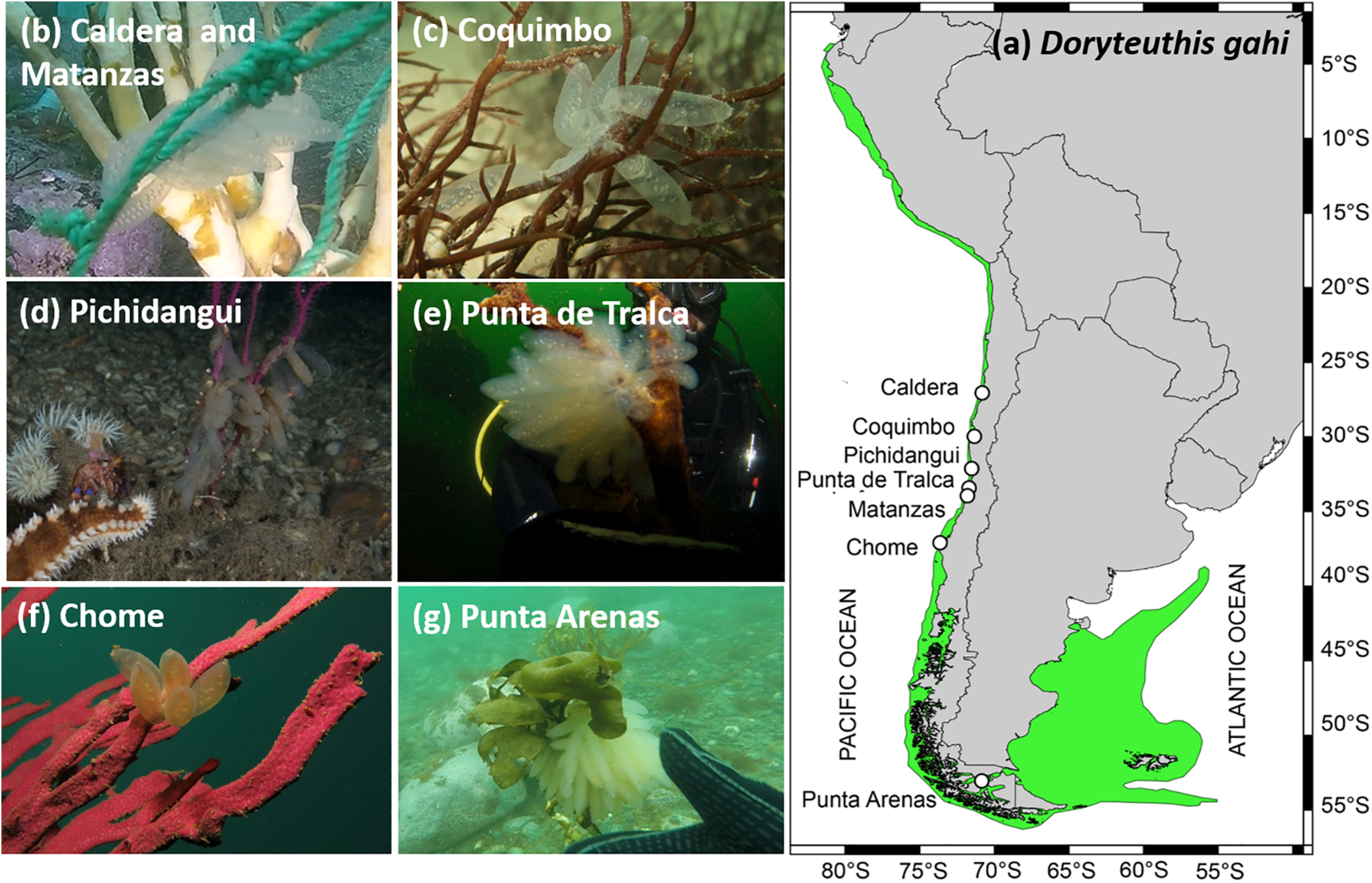 Schematic representation of spawning sites and substrates recorded from 2014 to 2020 along the Chilean Coast, where: (a) geographic distribution of Doryteuthis gahi in green; (b) Caldera and Matanzas: rope mooring; (c) Coquimbo: Sarcodiotheca gaudichaudii; (d) Pichidangui: Gorgoniidae; (e) Punta de Tralca: defoliated Lessonia trabeculata; (f) Chome: Gorgoniidae; (g) Punta Arenas: Lessonia flavicans. Photo credits: (b,c) Sergio Carrasco, (d) Alejandro Soza, (e) Alejandro Pérez-Matus, (f) Iván Hinojosa, and (g) César Cárdenas.