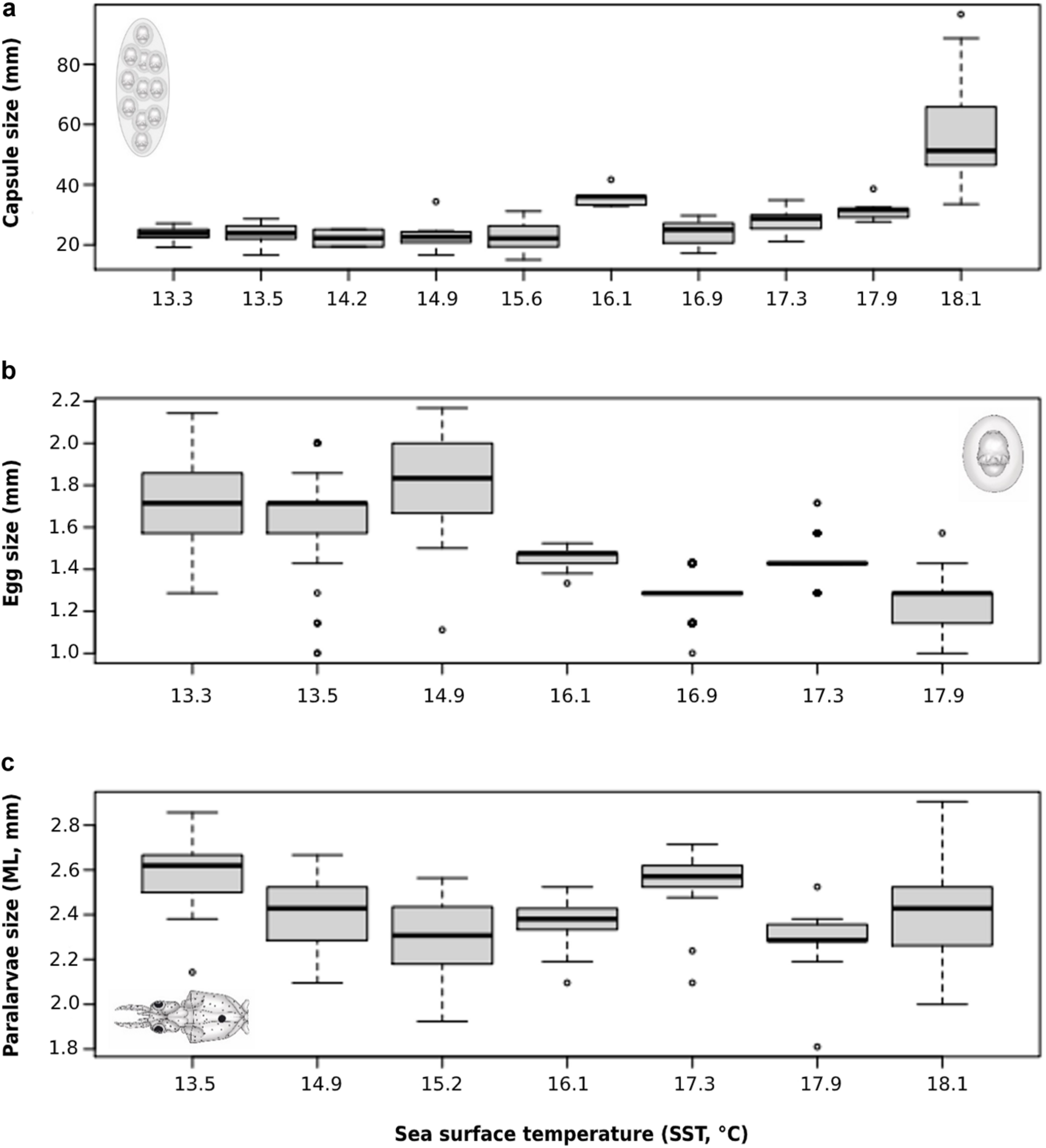 Early life-history traits of D. gahi collected at Herradura Bay, Coquimbo, between 2016 and 2020 under different sea surface temperature (SST) conditions, where: (a) capsule size (mm), (b) egg size (mm), and (c) paralarvae size (ML, mm). Central horizontal lines indicate median.