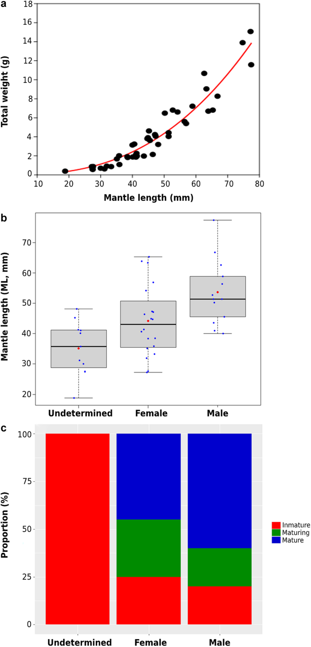 Samplings of older ontogenetic stages evidenced the constant presence of juvenile/adult squids through the year. In sum, 76 squids were collected with sizes ranging from around 19 to 77 mm ML and total wet weights from 0.3 to 15 g (Table 3). When combining all specimens collected (regardless survival time in laboratory), the power function model evidenced a strong positive relationship between squids’ mantle length (ML, mm) and weight (gr) (TW = 0.0014 ML2.642; t1,44 = 19.256, p < 0.001; Figure 3a).