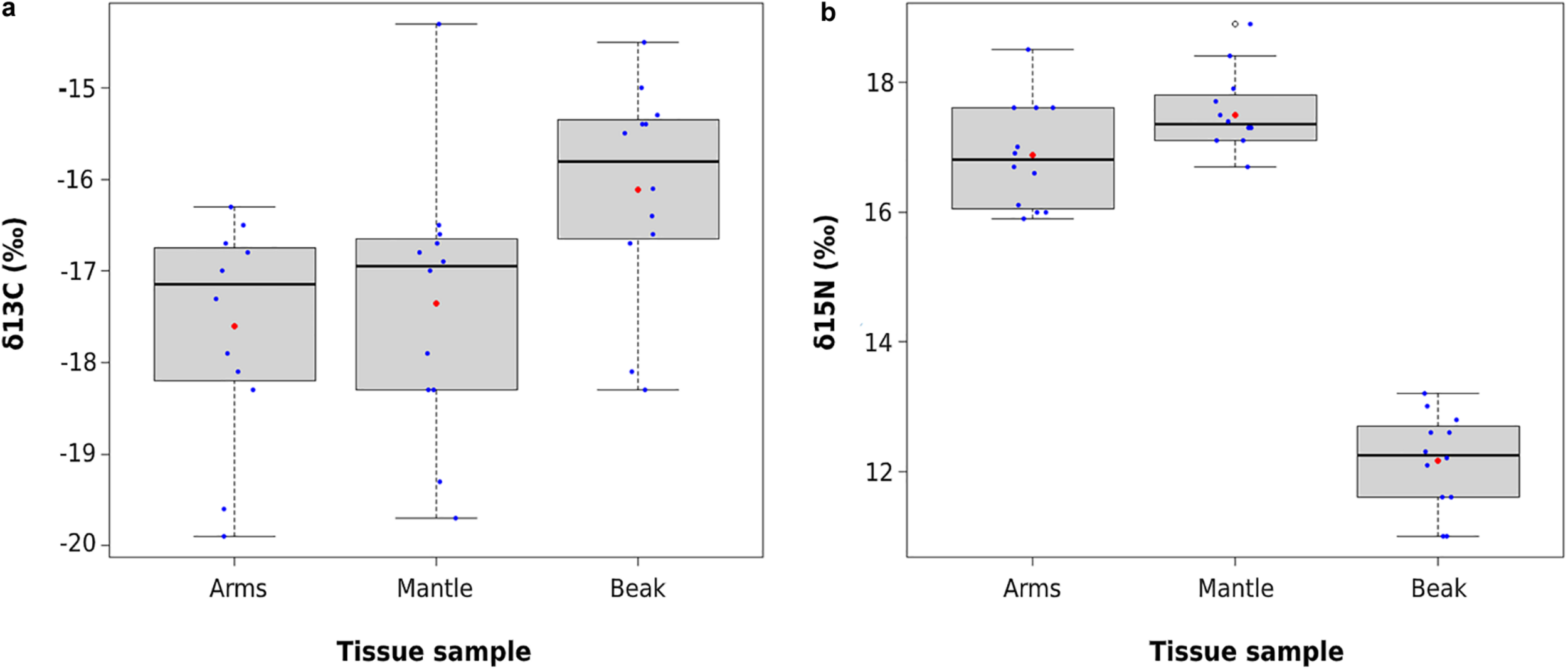Boxplot of isotopic composition of D. gahi, where: (a) δ13C and (b) δ15N values for different tissues (arms, mantle, and beak). Red circles indicate mean value and blue circles indicate individual data points. Central horizontal lines indicate median.