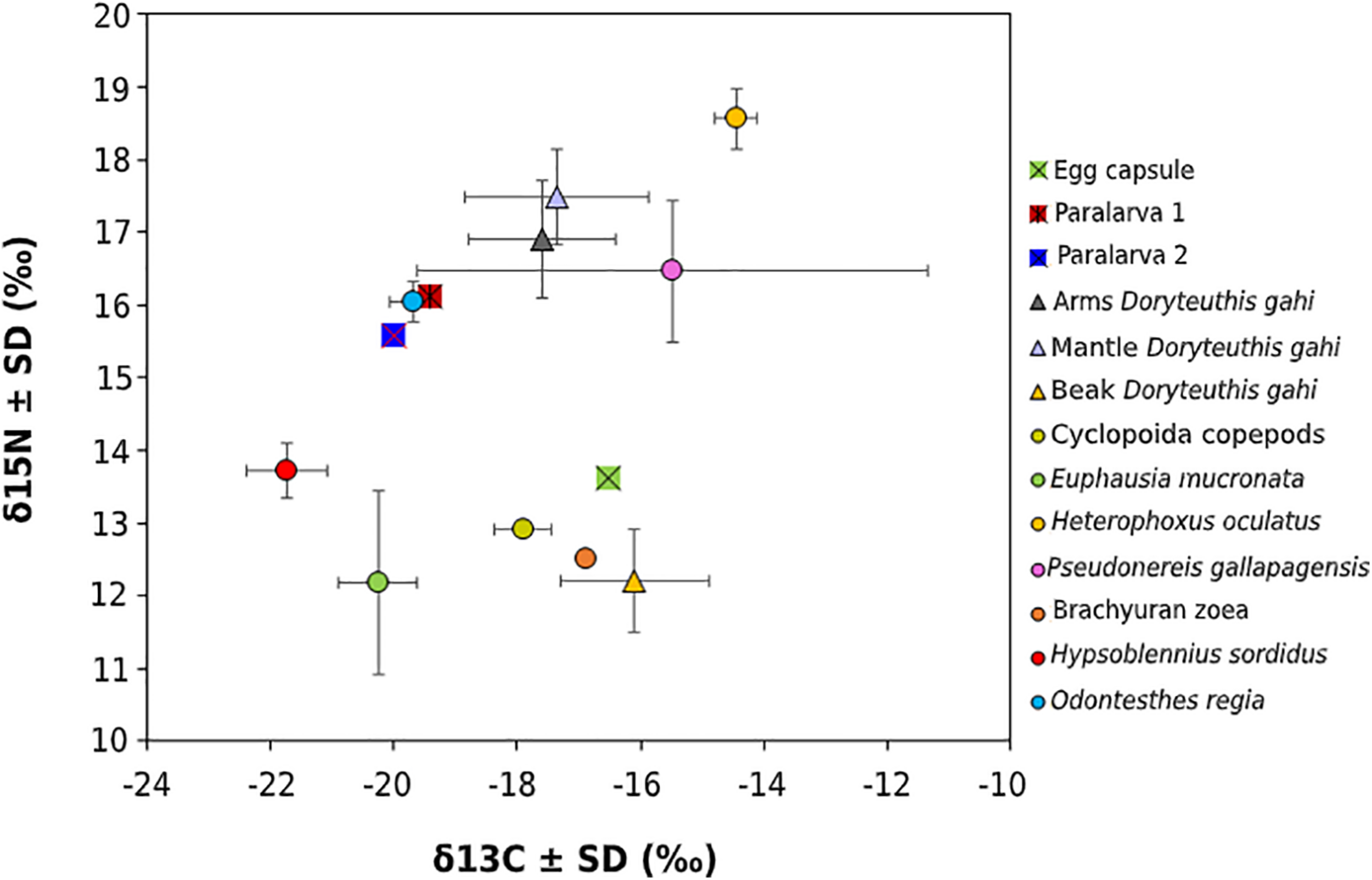 As described above, benthic egg capsules of D. gahi were collected during subtidal surveys, whereas juvenile/adult squids, small juvenile fishes, zooplankton (e.g., copepods, euphausiids, brachyuran zoeae), and emergent benthic fauna (e.g., amphipods, nereid polychaetes) were collected during nocturnal surveys. For squids’ egg capsules (post-spawning capsules without embryos) and newly hatched paralarvae, complete individuals were considered in the analyses. In the case of juvenile and adult squids, mantle, arms, and lower beaks were dissected to compare potential differences in stable isotopes values. Samplings from lower beaks were collected as suggested for several species of squids (Cherel and Hobson, 2005; Cherel et al., 2009a, b, 2019; Xavier et al., 2015) and benthic octopuses (Guerreiro et al., 2015; Matias et al., 2019). For juvenile fish, muscle pieces were sampled, whereas for euphausiids, amphipods and polychaetes, complete individuals were used. Due to their small sizes and weights, samples of copepods and brachyuran zoeae were obtained by pooling ∼ 10 individuals to complete the necessary mass. In all cases, around 10 mg of wet tissue (in order to get ∼1 mg dry mass) was obtained, washed with Milli-Q water, placed in pre-combusted vials, and dried in an oven (60°C) for 48 h to be grounded into a fine powder with an agate mortar. Small amounts (∼0.5 mg) were placed in pre-weighed tin capsules and stored in a desiccator until the shipment for stable isotope analyses. When possible, voucher specimens were preserved in 95% ethanol and deposited at Sala de Colecciones Biológicas Universidad Católica del Norte (SCBUCN) for further taxonomic corroboration and genetic analyses. These ethanol-preserved specimens are also suitable for future isotopic analyses (see Pauli et al., 2017).