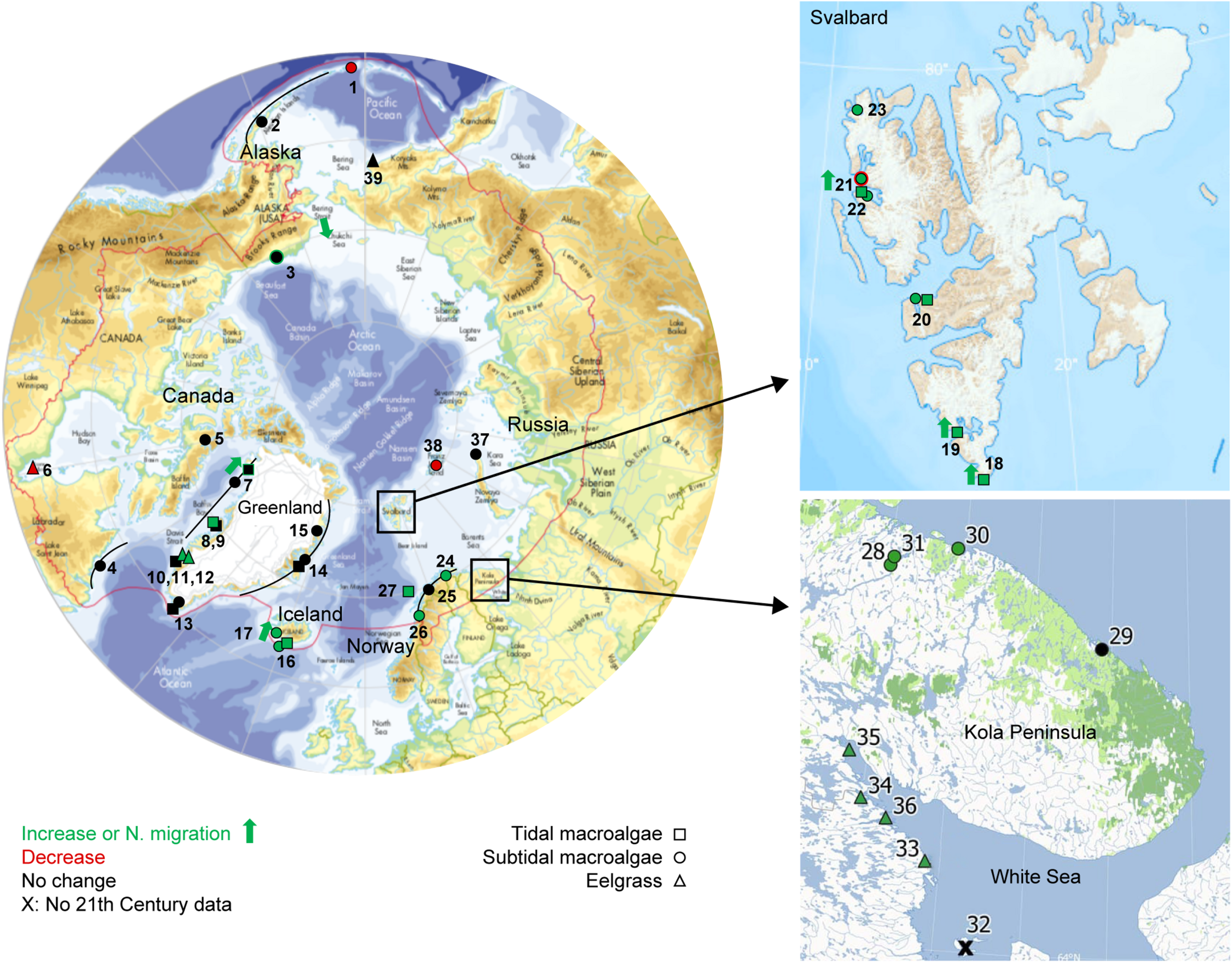 Overview of compiled studies on pan-Arctic marine vegetation trends spanning at least 10 years and entering into the 21th Century. Trends are marked as increasing (green), declining (red) or no change (black) for subtidal macroalgae (circles), intertidal macroalgae (squares), and eelgrass (triangles). Northward migration is indicated by green arrow. If the site represents trends for more than one period, only the most recent is shown, and if this did not include the 21th Century, the site is marked by X. A line through a circle/square indicates that there are several sites along a gradient. The red line defines the Arctic region based on the Arctic Council definition (Huntington, 2001). Numbers refer to sites specified in Table 1. Close-up of study sites in Svalbard and Russian Barents Sea/White Sea. Main map from Huntington, 2001, Svalbard map from Norwegian Polar Institute.
