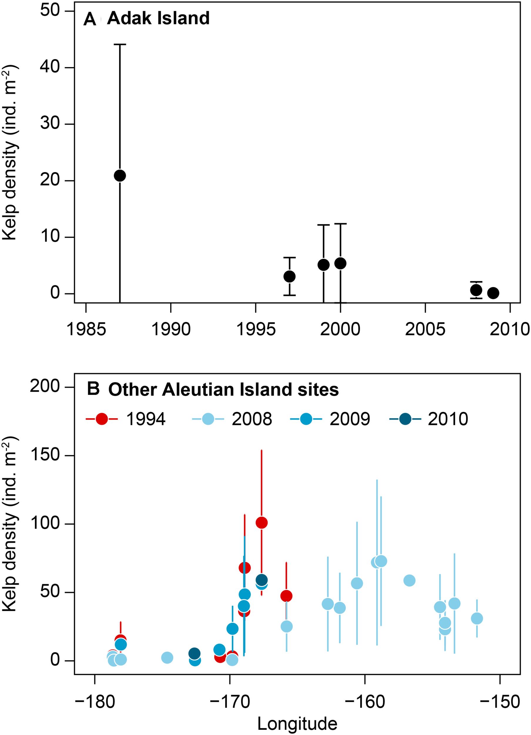 Time series of kelp density (Mean ± SD) in Aleutian Islands, Alaska: (A) Adak Island 1987–2009 (the most data-rich site, –176.6°W), (B) various sites in Aleutian Islands in 1994 and late 2000s. Data sourced from NCEAS dataset (Krumhansl et al., 2016).