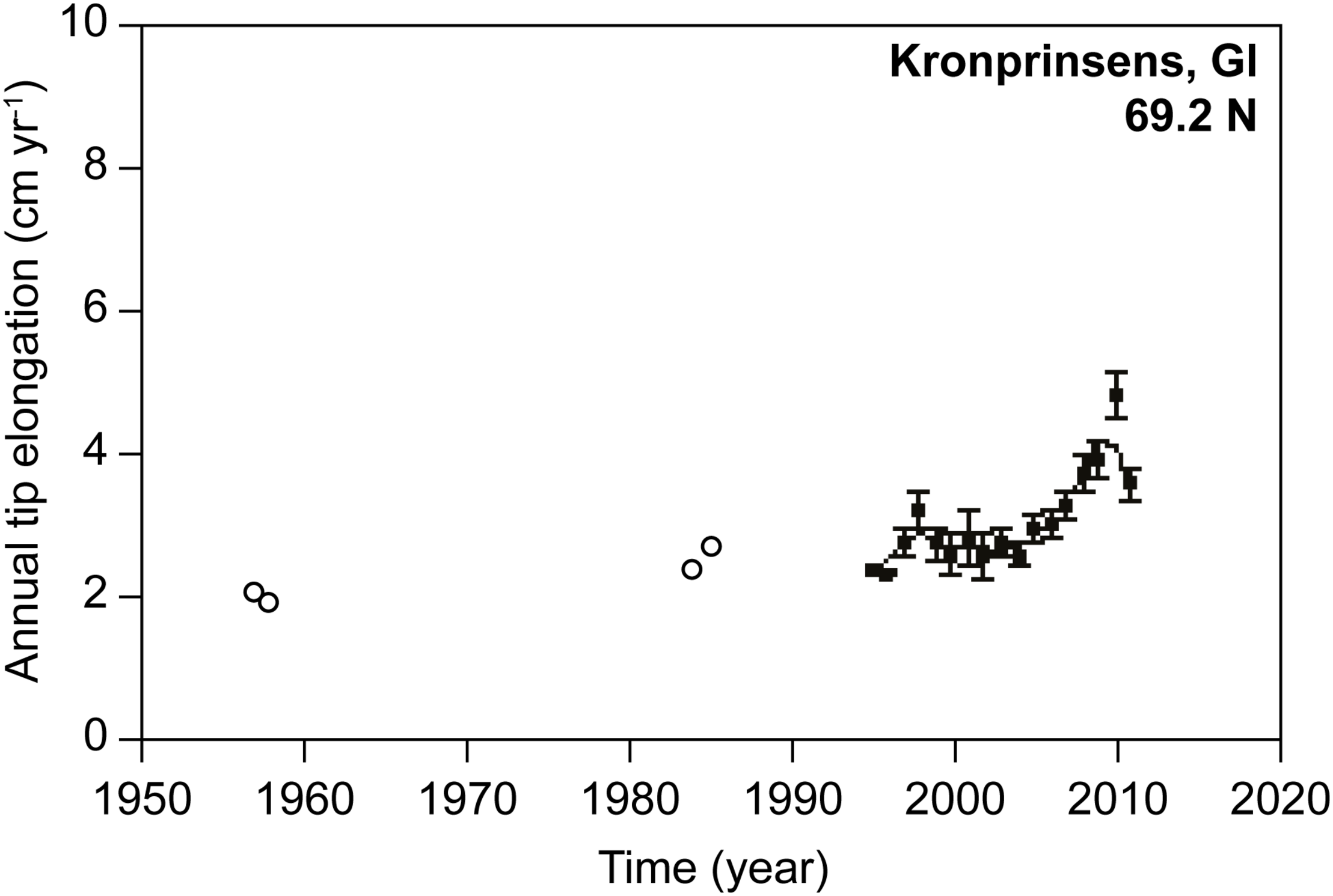| (8) Disko Bay, Kron-prinsens Ejland | 69.02°N, −53.00°W | 1959–2012 | i | Ascophyllum growth | Ia | O,W | nd | Marbà et al., 2017 |