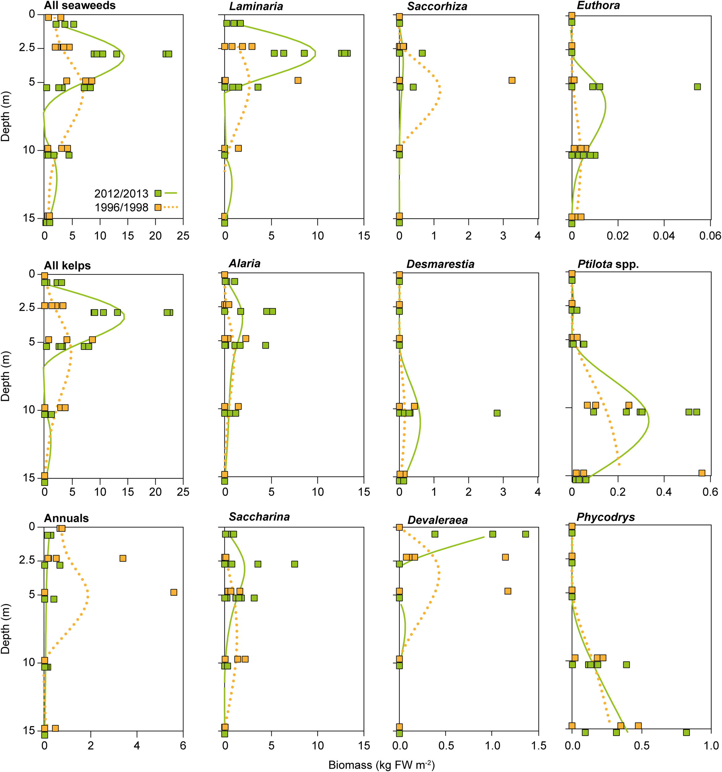| (27) Lofoten | 67.835°N, 12.820°E | 1997–2009 | i | Ascophyllum growth | Na | W | nd | Marbà et al., 2017 |