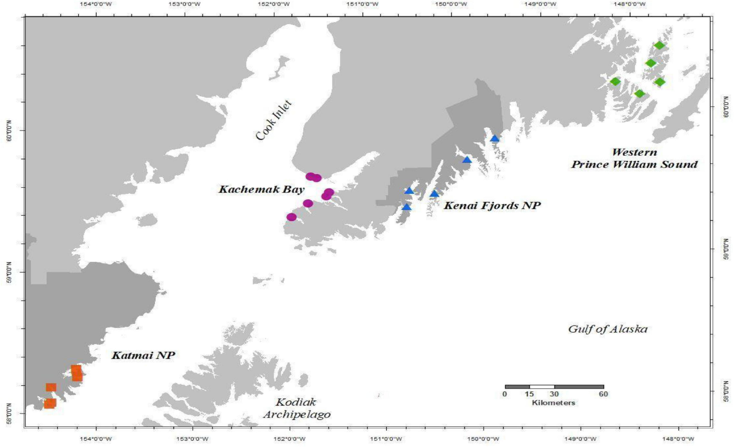 Map of study area showing Gulf Watch Alaska nearshore rocky intertidal sites as described in Konar et al. (2016), monitored annually 2012–2019 in each region, Western Prince William Sound (green diamonds), Kenai Fjords NP (blue triangles), Kachemak Bay (purple circles), and Katmai NP (red squares). Dark gray shaded land demarks National Park (NP) boundaries.