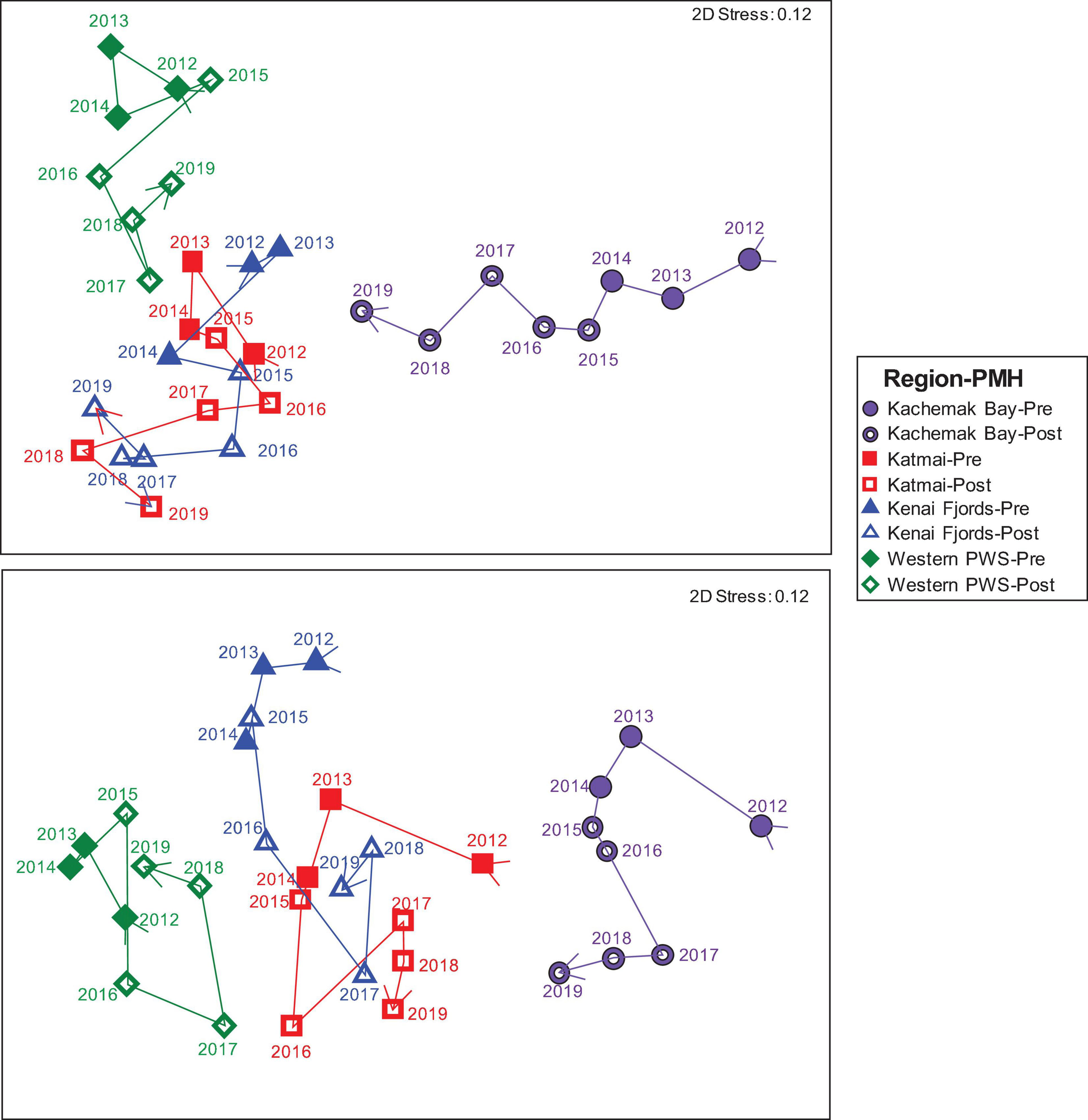 nMDS of Bray Curtis similarities of rocky intertidal community structure by region: Western Prince William Sound (green diamonds), Kenai Fjords (blue triangles), Kachemak Bay (purple circles) and Katmai National Park (red squares), and by tidal stratum: low (lower panel) and mid (upper panel) across all years (2012–2019) as denoted by the arrow vector connecting each point. Closed symbols represent pre-PMH and open symbols represent the during/after (Post) PMH. Each point represents the mean similarity for each region-stratum-year sample combination.