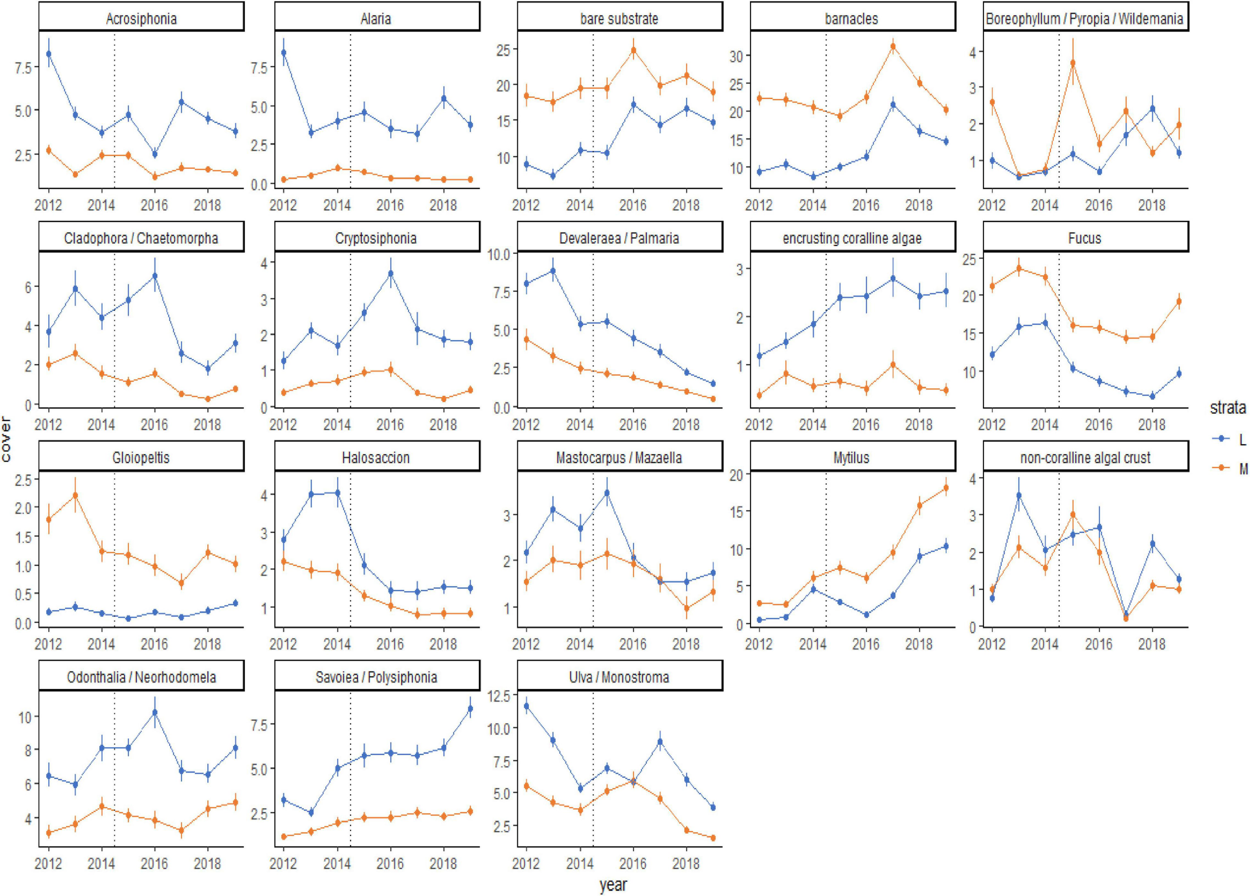 Although the percent cover of some taxa differed between the before and during/after PMH time periods, how those changes occurred over time were variable (Figure 5). Some changes were seen as gradual increases (Savoiea/Polysiphonia) or decreases (Devalerea/Palmaria, encrusting coralline algae, and Halosaccion). Others had a time lag associated with the change (bare substrate, barnacles, and Ulva/Monostroma). While some taxa decreased initially after the PMH, they appeared to be recovering or starting to recover in the later study years (Cladophora/Chaetomorpha, Fucus, and Odonthalia/Neorhodomela). Lastly, some taxa were associated with high interannual variability (Boreophyllum/Pyropia/Wildemania and non-coralline algal crust). In general, percent cover trends were similar in both strata, except for when a taxon did not have high cover in one of the strata (Alaria, Cryptosiphonia, and Gloiopeltis). The predominant sequence of changes that occurred across all regions included a loss of macroalgae with the onset of the PMH, which opened up bare space in 2016, leading to a peak in barnacles in 2017 and then in mussels in 2018 and 2019 (Figure 5).