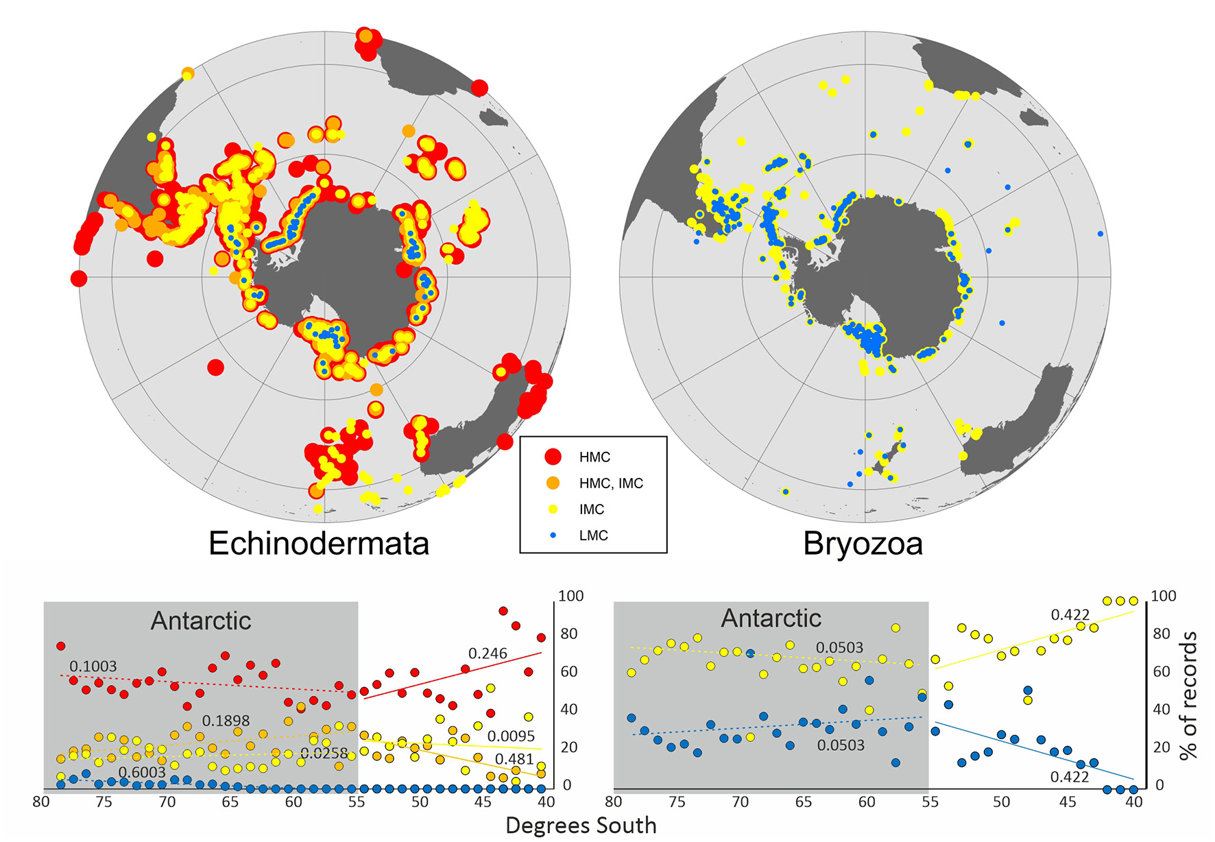 General distribution patterns for Echinodermata (24 HMC, 3 HMC/IMC, 6 IMC, and 1 LMC species) and Bryozoa (59 IMC and 30 LMC species) based on Mg-calcite distribution in the Southern Ocean.