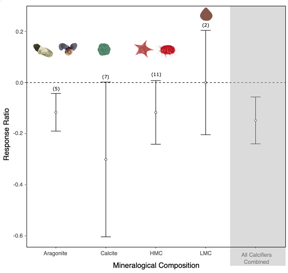 The effect of ocean acidification on aragonitic, calcitic, high-Mg calcite (HMC), and low-Mg calcite (LMC) species. Mean response ratios and 95% confidence intervals are shown, with the number of data points in each category given in brackets. A mean response ratio of zero (hashed line) indicates no effect. Background shading indicates response ratios of all the phyla.