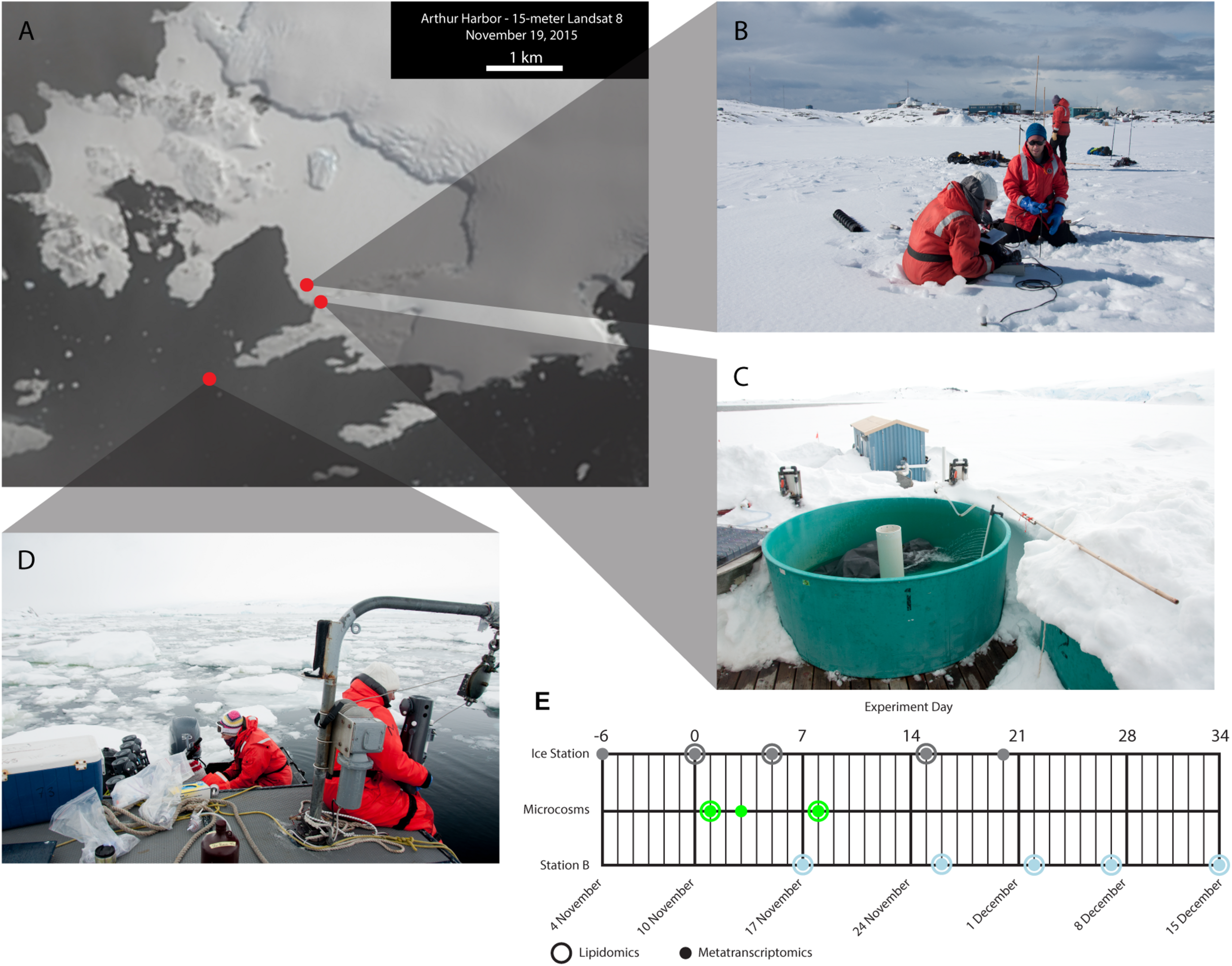 Site descriptions and experimental time-line. (A) Landsat imagery (15 m resolution) of southern Anvers Island on November 19, 2015. The landfast sea ice in Arthur Harbor is readily apparent. Red circles indicate the location of the Ice Station (B), Palmer Station and the outdoor incubators (C), and Palmer LTER Station B (D). (E) Experimental time-line showing when samples were collected for lipidomics and metatranscriptomics for each sampling location. Note that the Ice Station day 0 sample is also the day 0 sample for the microcosms.