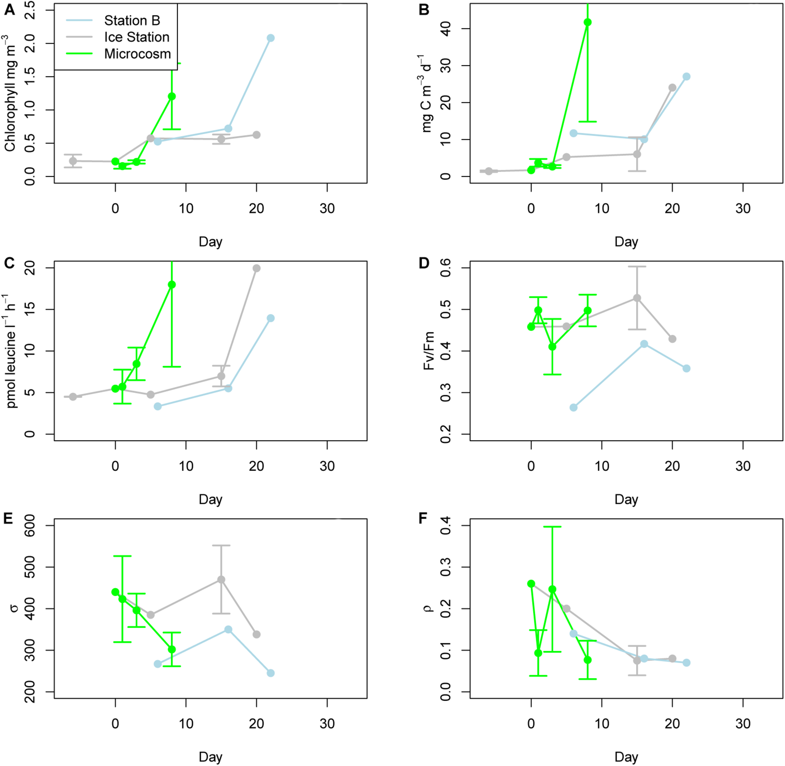 Ecophysiology. (A) Chlorophyll a concentrations for Station B (located in the marginal ice zone), the Ice Station, and microcosms. (B) Primary production according to H-14CO3 uptake. (C) Bacterial production as determined from the uptake of 3H-leucine. (D) Fv/Fm as determined by fluorescence induction and relaxation (FIRe). (E) σPSII, a measure of the absorption cross-sectional area for photosystem II as determined by FIRe. (F) ρ, a measure of reaction center connectivity as determined by FIRe. Ecophysiology parameters for Station B and the Ice Station represent a single measurement, as provided by the Palmer LTER project. Values for the microcosms on days 1, 3, and 8 represent the means of triplicates.
