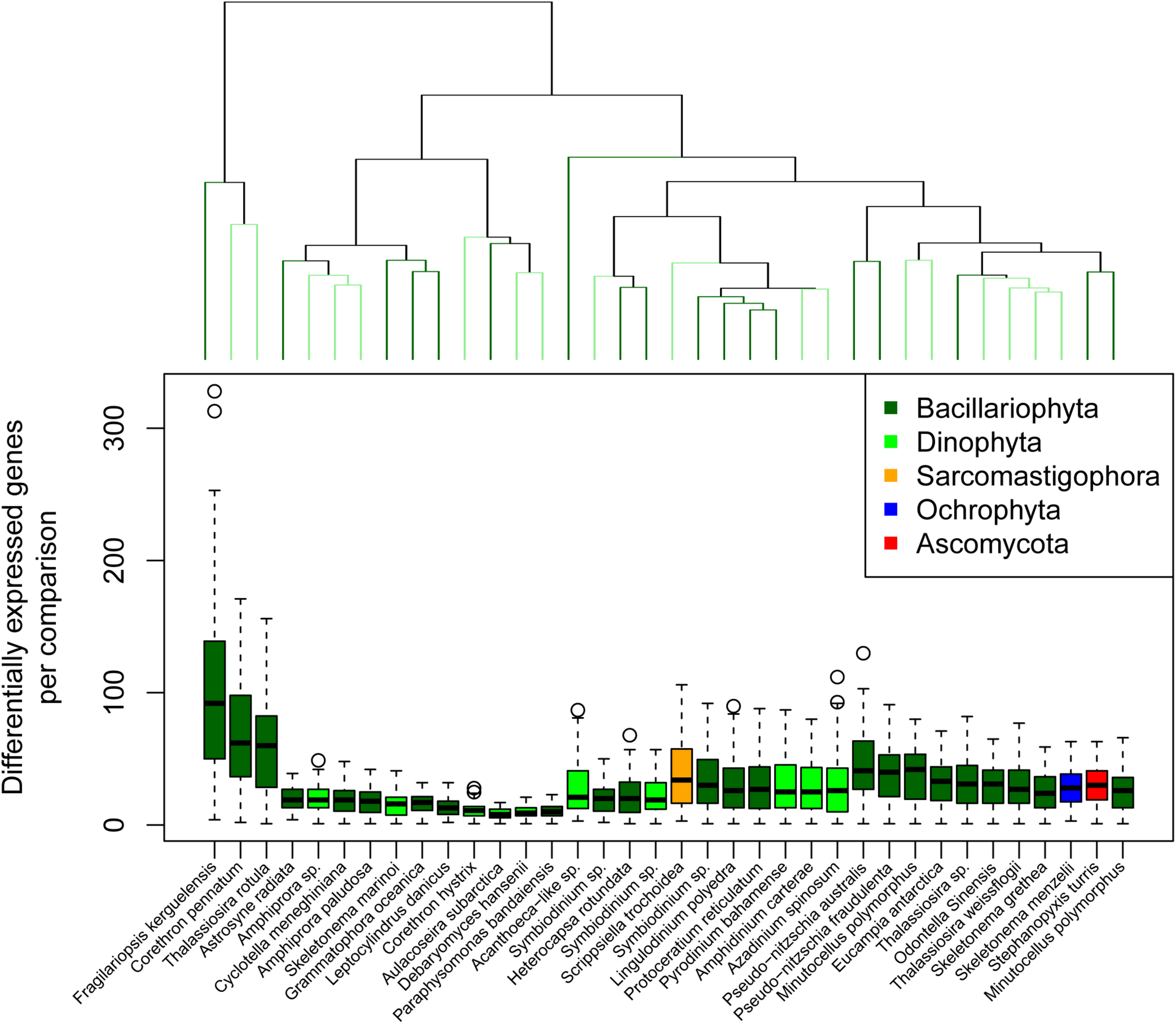We identified 93 reference genomes/transcriptomes with significantly differentially expressed genes. Of these, 37 had differentially expressed genes for all points of comparison. These were primarily eukaryotic reference transcriptomes from the MMETSP, but included one prokaryotic reference genome; GCF_000012305.1 (Psychrobacter arcticus 273-4). The prokaryotic genome was not considered further in our analysis. The remaining reference transcriptomes included 23 members of Bacillariophyta (diatoms), 10 Dinophyta (dinoflagellates), 1 Ascomycota (fungi), 1 Ochrophyta (a chrysophyte or golden algae), and 1 Sarcomastigophora (Table 1). Each reference transcriptome could represent a range of more or less closely related phytoplankton present in the system. Here, when we refer to a reference transcriptome by name we are referring to the collection of phytoplankton with gene transcripts that mapped to that reference transcriptome. This approach does not imply a close evolutionary relationship between the reference and environmental phytoplankton. For brevity the strain name of each reference transcriptome is included only at first use.