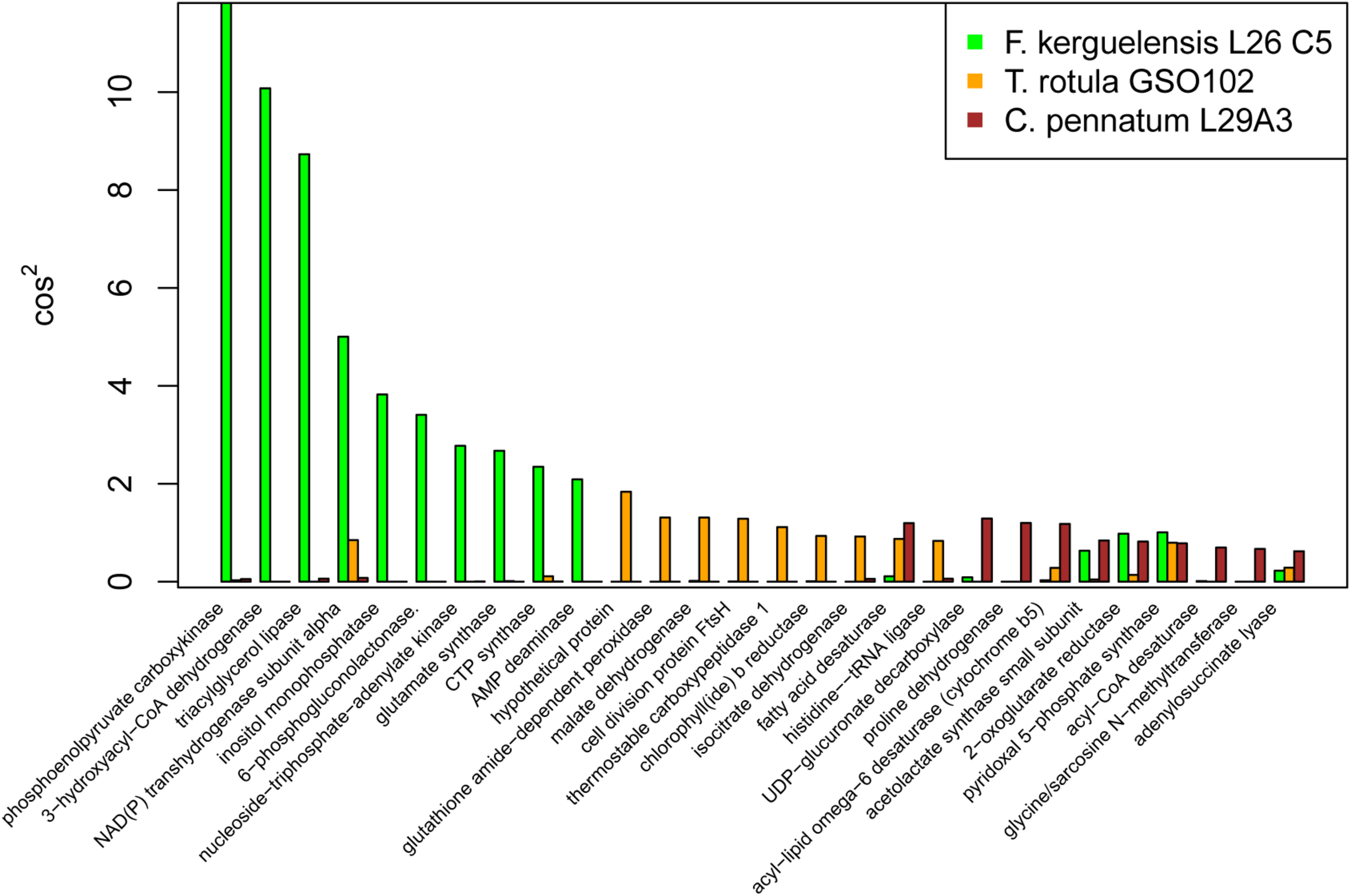 To take a closer look at the three reference transcriptomes that exhibited the highest response complexity (T. rotula, F. kerguelensis, and C. pennatum) we considered the transcripts for each reference with the highest cos2 values for PC1 (Figure 5). These transcripts were presumed to contribute strongest to the transcriptional response described by PC1. Each of these references had a different transcriptional profile according to cos2, with the largest cos2 values associated with Ficus kerguenlensis. For that reference, contributions to PC1 were led by transcripts coding for phosphoenolpyruvate carboxykinase (EC 4.1.1.49), 3-hydroxyacyl-CoA dehydrogenase (EC 1.1.1.35), and triacylglycerol lipase (EC 3.1.1.3). Transcripts contributing most to PC1 for T. rotula coded for a hypothetical protein, a glutathione amide-dependent peroxidase (EC 1.11.1.17), malate dehydrogenase (EC 1.1.1.37), and cell division protein FtsH (EC 3.6.4.3). For C. pennatum, major contributors to PC1 included UDP-glucuronate decarboxylase (EC 4.1.1.35), proline dehydrogenase (EC 1.5.5.2), fatty acid desaturase (EC 1.14.19.3), and acyl-lipid omega-6 desaturase (EC 1.14.19.22).