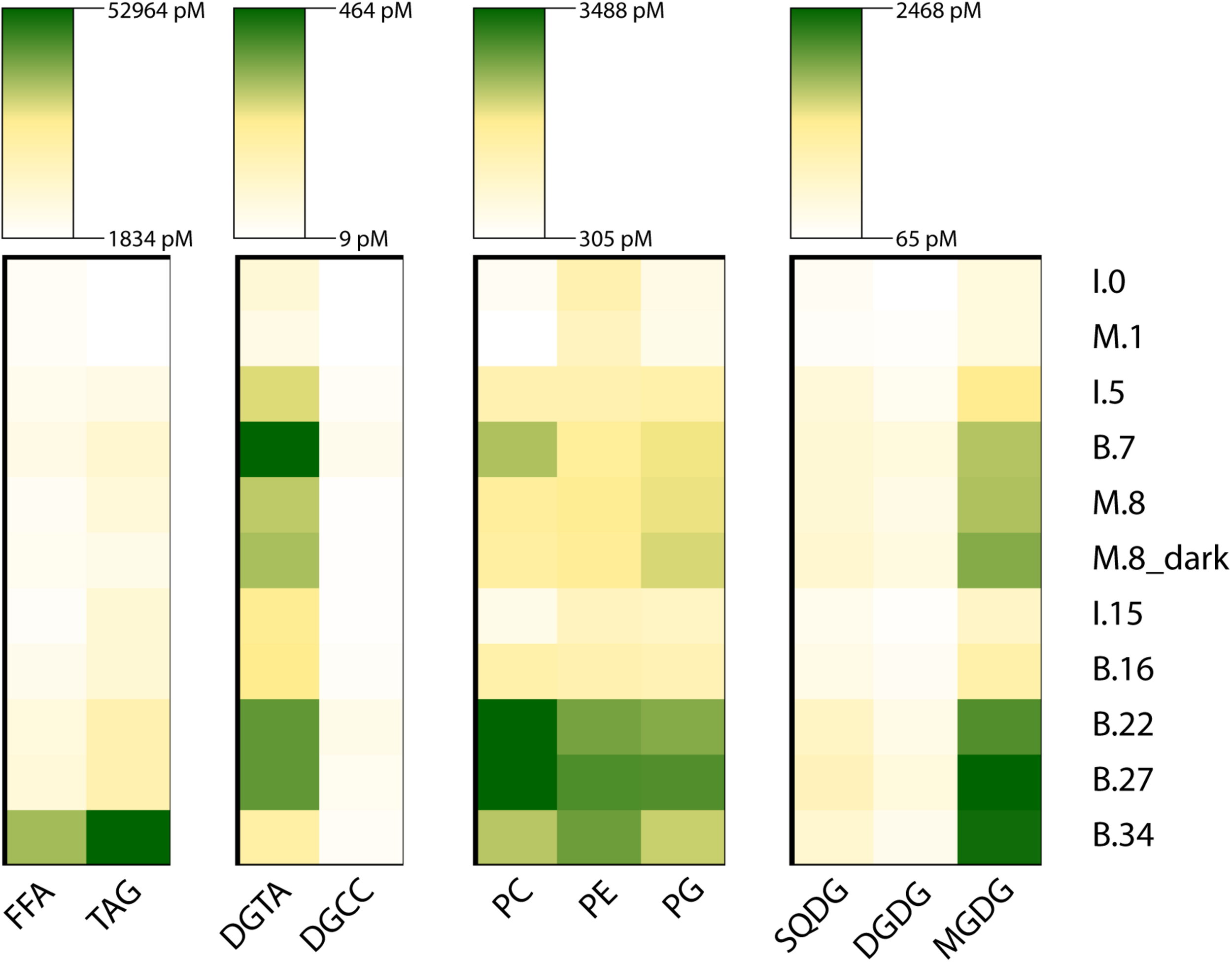 The abundance of major lipid classes during the experiment. The rows are sampling point, where the letter indicates experimental condition (I, ice station; M, microcosm; B, Station B), the number indicates days since the start of the experiment on November 10, 2015. The lipids are grouped according to abundance (TAG and FFA) and physiological role (DGTA and DGCC; PC, PE, and PG; SQDG, DGDG, and MGDG). Due to the large difference in abundance between groups each group is scaled differently.