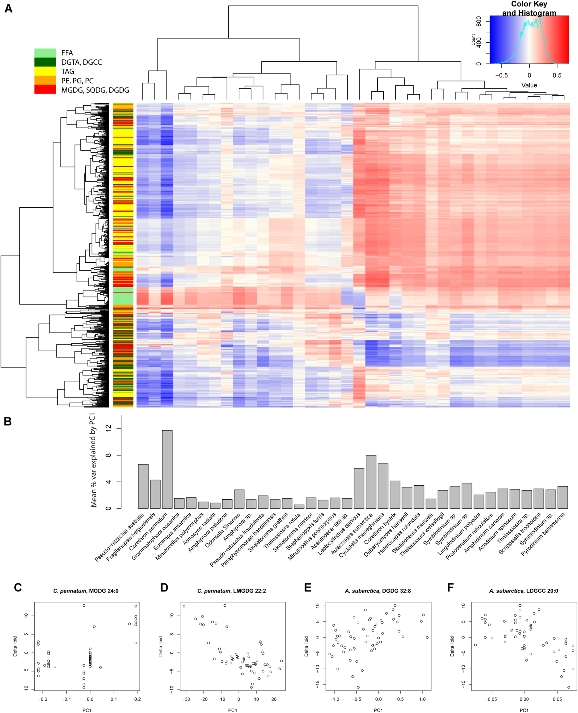 Correlation between the first principal component (PC1) and individual lipids for each reference transcriptome. (A) Matrix of Pearson’s correlation coefficient (r) for each lipid and PC1 for all reference transcriptomes. Columns and rows of the correlation matrix are organized according to hierarchical clustering based on Euclidean distance. Row colorbar indicates the class of lipid. FFA, free fatty acid; DGTA, Diacylglyceryl hydroxymethyl-trimethylalaninee; DGCC, Diacylglyceryl hydroxymethyl-trimethylalaninee; TAG, triacylglycerol; PE, phosphatidylethanolamine; PG, phosphatidylglycerol; PC, phosphatidylcholine; MGDG, monogalactosyldiacylglycerol; SQDG, sulfoquinovosyldiacylglycerol; DGDG, digalactosyldiacylglycerol. (B) Barplot of mean % variance explained for all lipids by PC1 for each reference transcriptome. Calculated by taking the mean of r2 for each column in (A). These values are distinct from the variance explained by PC1 for the transcriptome data described by the principal components. (C–F) Scatterplots of Δlipid and PC1 for the highest r2 values for Corethron pennatum (MMETSP0169) and Aulacoseira subarctica (MMETSP1064). These two reference transcriptomes had the highest mean % variance explained by PC1.