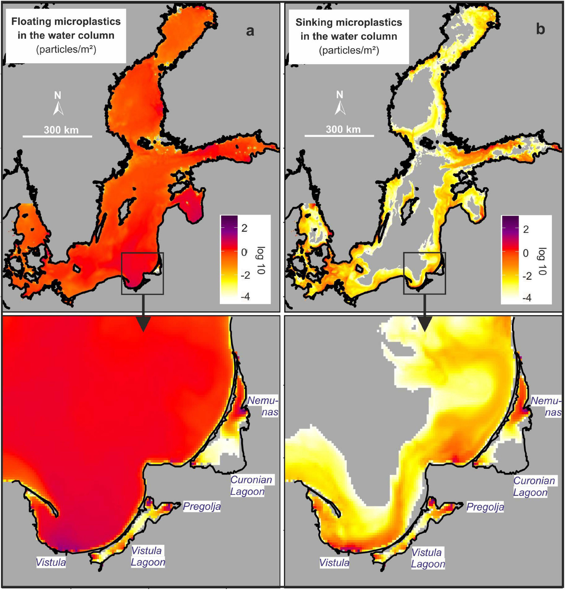 Average annual spatial concentration of (a) floating and (b) sinking microplastic particles (20–500 μm size fraction) in the water column in the Baltic Sea and the wider Bay of Gdańsk based on simulations with a 3D hydrodynamic model. Gray areas in the sea indicate concentration below the colour scale.