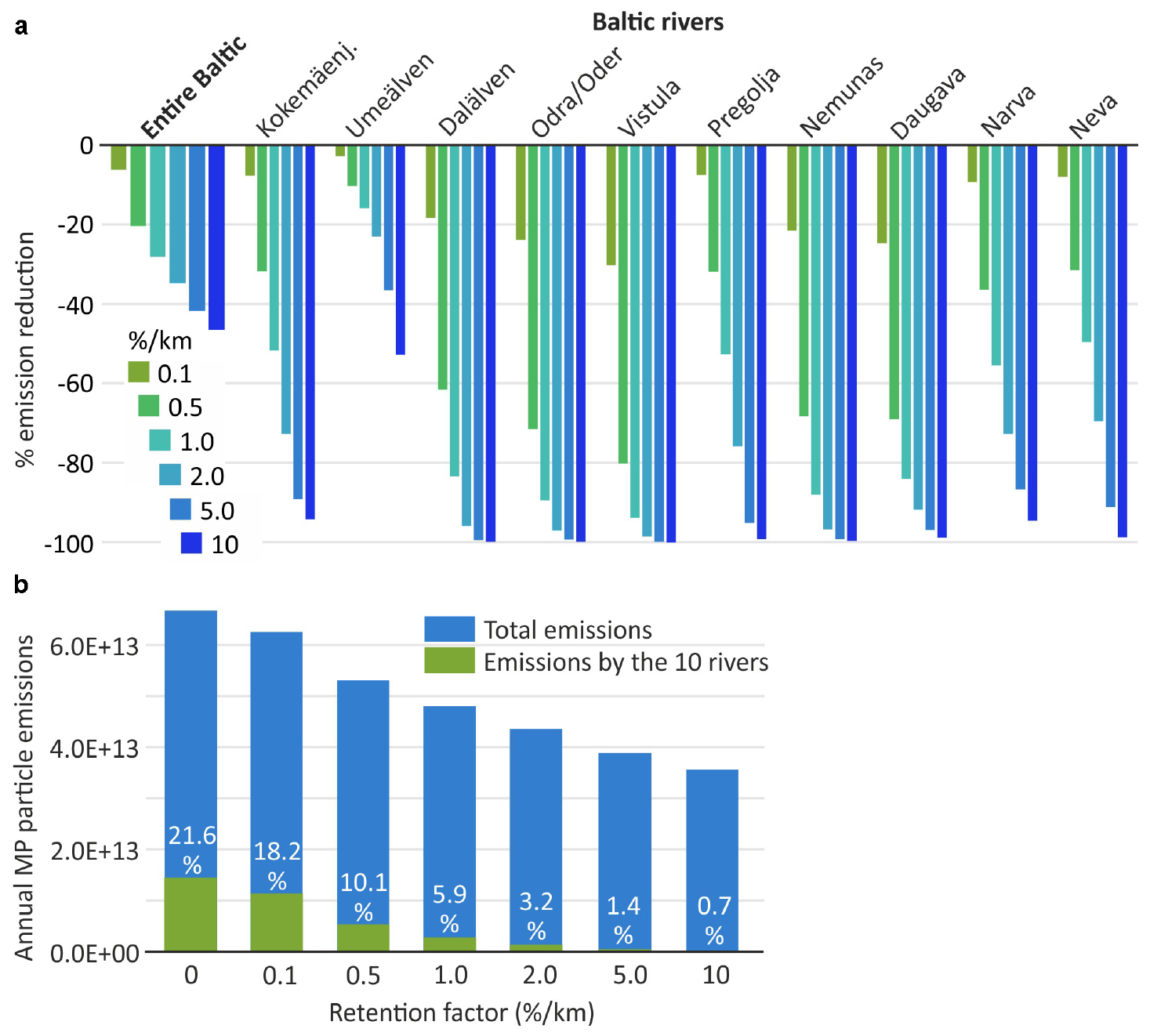 (a) Relative reduction of annual micro-plastic particle emissions reductions (floating and sinking fraction, size class 20–500 μm) to the Baltic Sea assuming different micro-plastics retention factors (%/km) in rivers, calculated for the entire Baltic Sea catchment and 10 selected rivers. The reduction is related to the present load of every river. (b) Absolute annual micro-plastics particle emissions resulting from increasing micro-plastic retention factors (%/km) in rivers as well as relative share of the 10 rivers compared to the total emissions to the Baltic Sea.