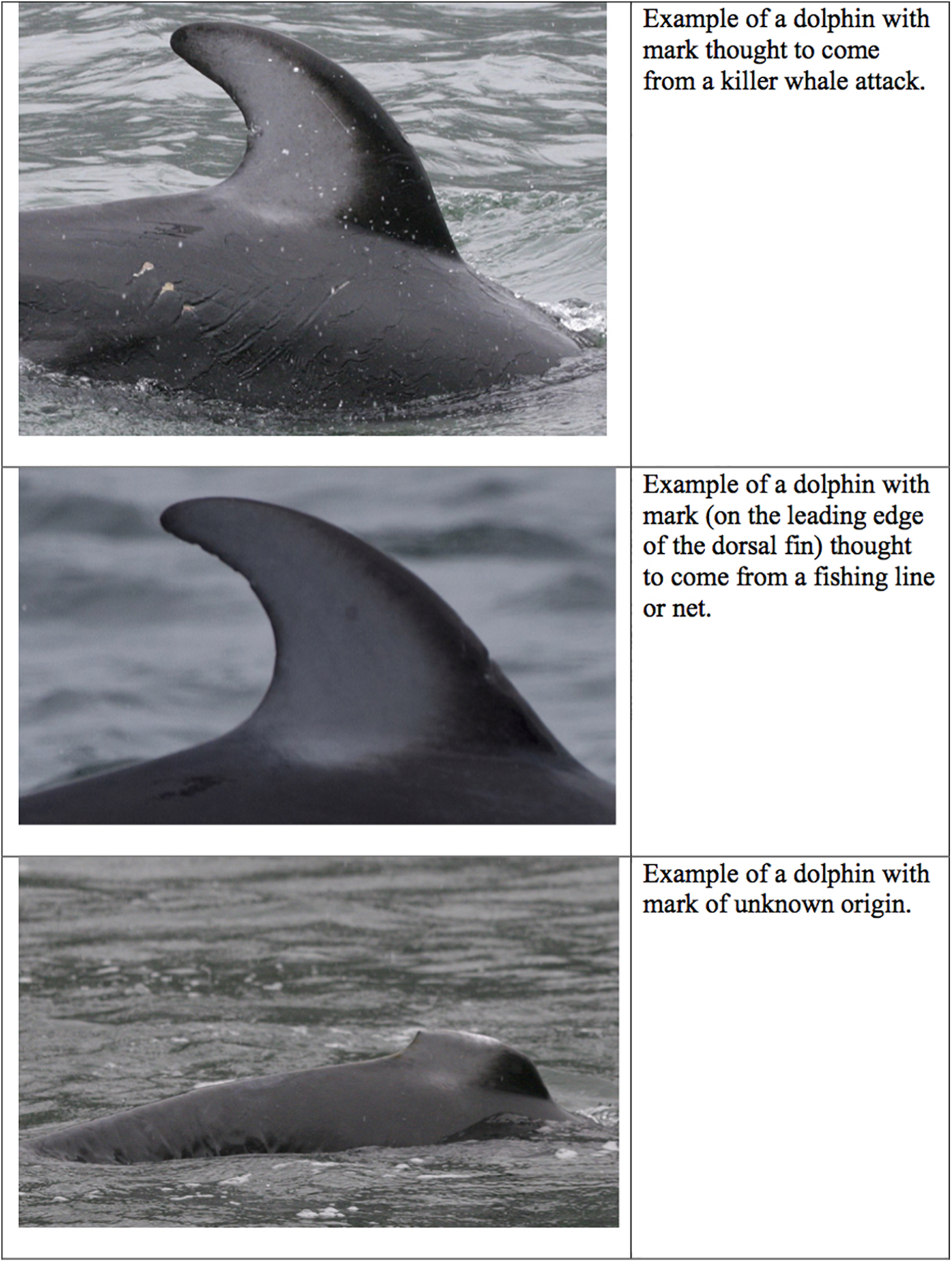 Recommendations have been made on the need for objective criteria for attributing an anthropogenic cause to marine mammal mortality or morbidity cases (Moore et al., 2013). We thus sought feedback from experienced marine mammal stranding coordinators and veterinary pathologists to assess whether a sample from these photographs were indeed consistent with killer whale rake marks, and to distinguish between fresh wounds and healed scars. We selected a sample of 22 high-quality photos of individual dolphins with injuries that included missing and mangled dorsal fins, parallel scars on the dorsal fin and/or body, and non-parallel or random scars on the body.
