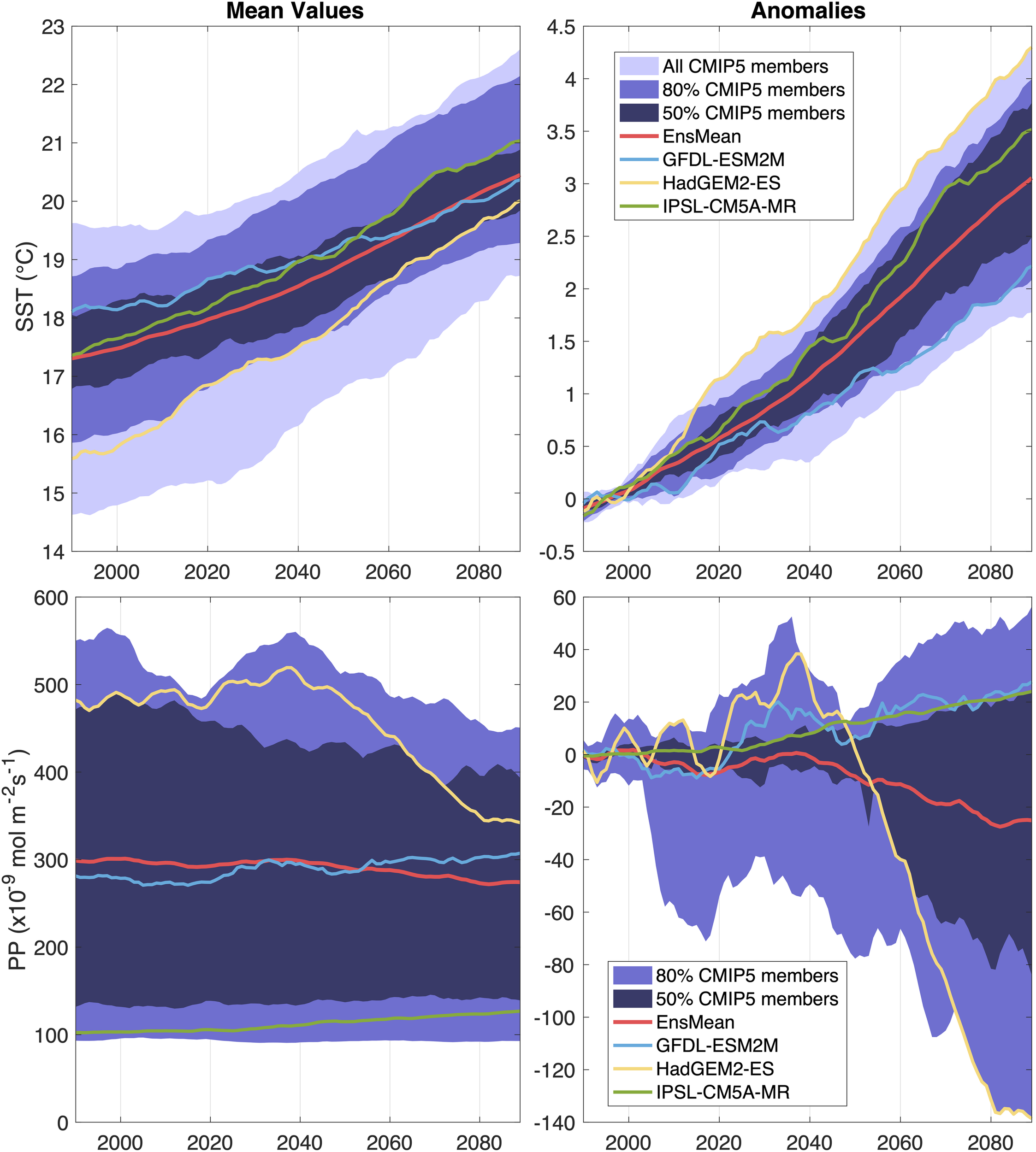 Time series of yearly averages of the California Current sea surface temperature (SST, first row) and primary production (PP, second row) for the 1976–2099 period, averaged over the California Current Large Marine Ecosystem. The simulations are forced using historical emissions (1976 to 2005) and the RCP8.5 scenario for future projection (2006 to 2099). Left panels show the mean values and right panels show the anomalies relative to the 1976–2005 climatology. A 20-year running mean is applied. The figure is adapted from the NOAA climate website (https://www.psl.noaa.gov/ipcc).