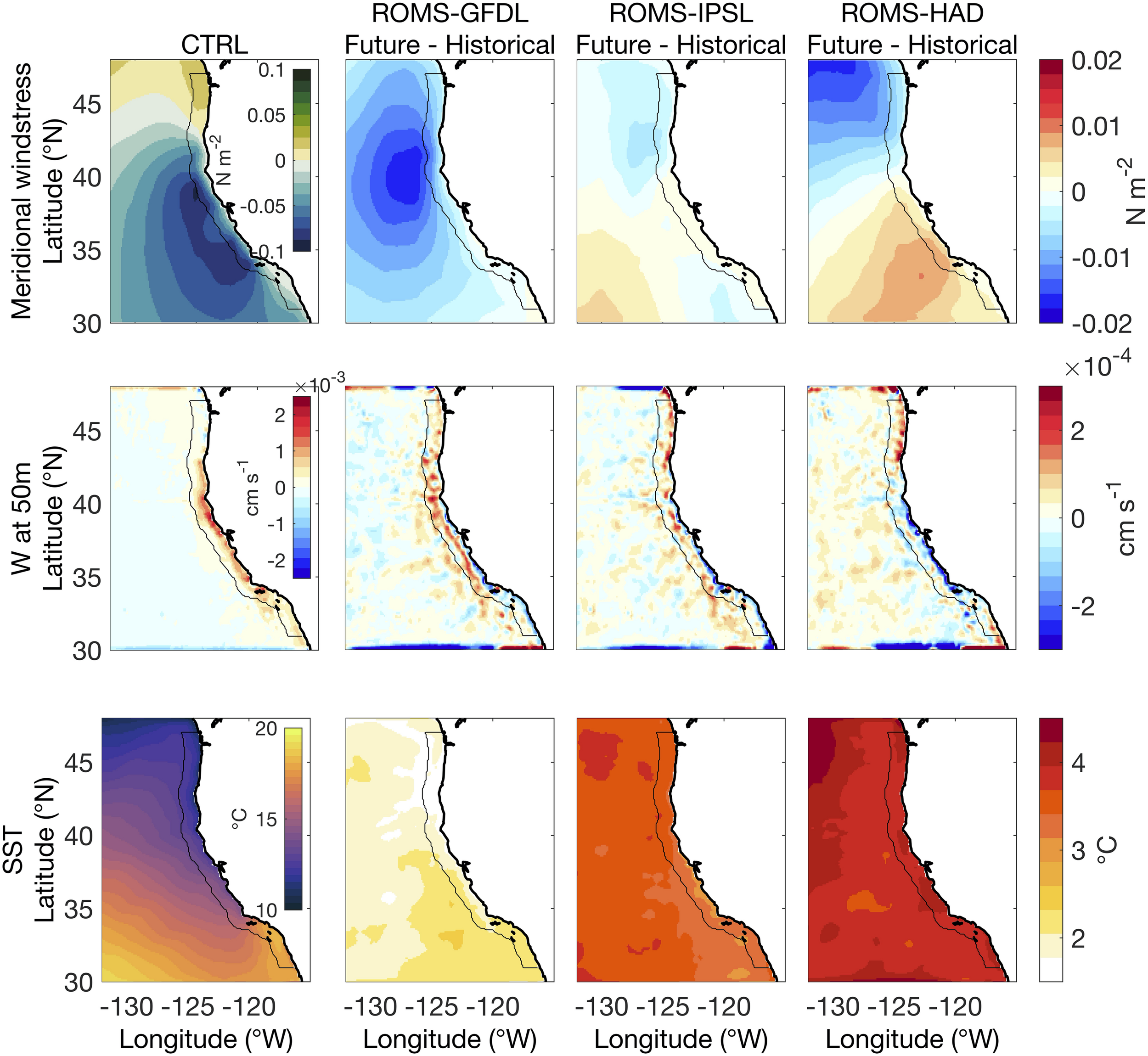 We use vertical velocity at 50 m as a measure for upwelling (Figure 2). The projected increase in the equatorward meridional wind stress over the northern coastal region of the CCS enhances coastal upwelling (upward and positive vertical velocity changes) in the three ESM-driven downscaled ROMS simulations. While ROMS-GFDL and ROMS-IPSL projections show an overall upward velocity all along the coast of the domain, the intense weakening of the alongshore-wind stress projected by ROMS-HAD reduces coastal upwelling in the southern part of the domain.