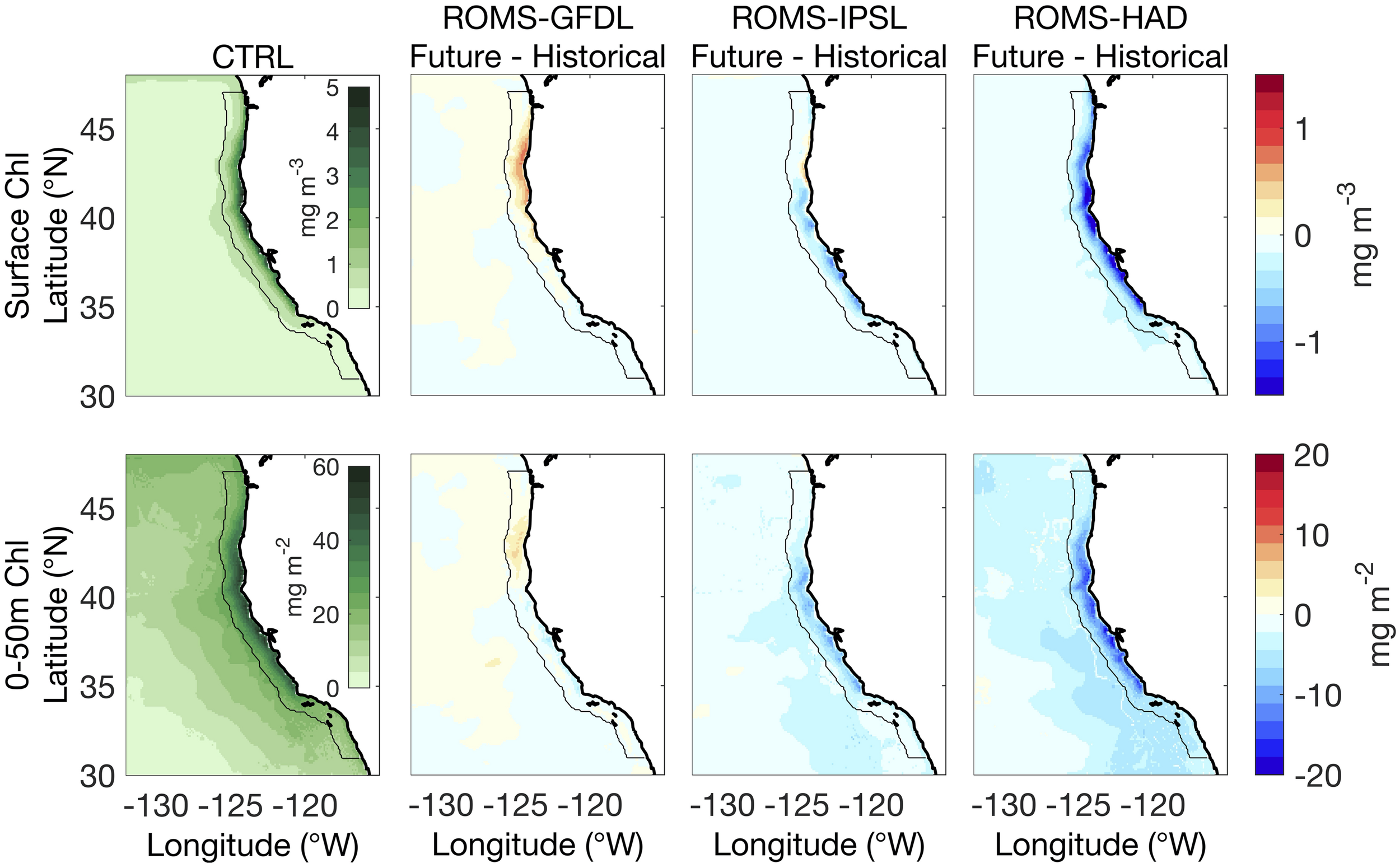 Control run (1980–2010) mean and future changes (2070–2100 relative to historical) for the surface (top) and integrated (0–50 m, bottom) chlorophyll (Chl). Columns show data for the historical period in the control simulation (CTRL, first) and the future changes from the high-resolution downscaled projections: ROMS-GFDL (second column), ROMS-IPSL (third column), and ROMS-HAD (fourth column). Black contour marks 100 km from shore.