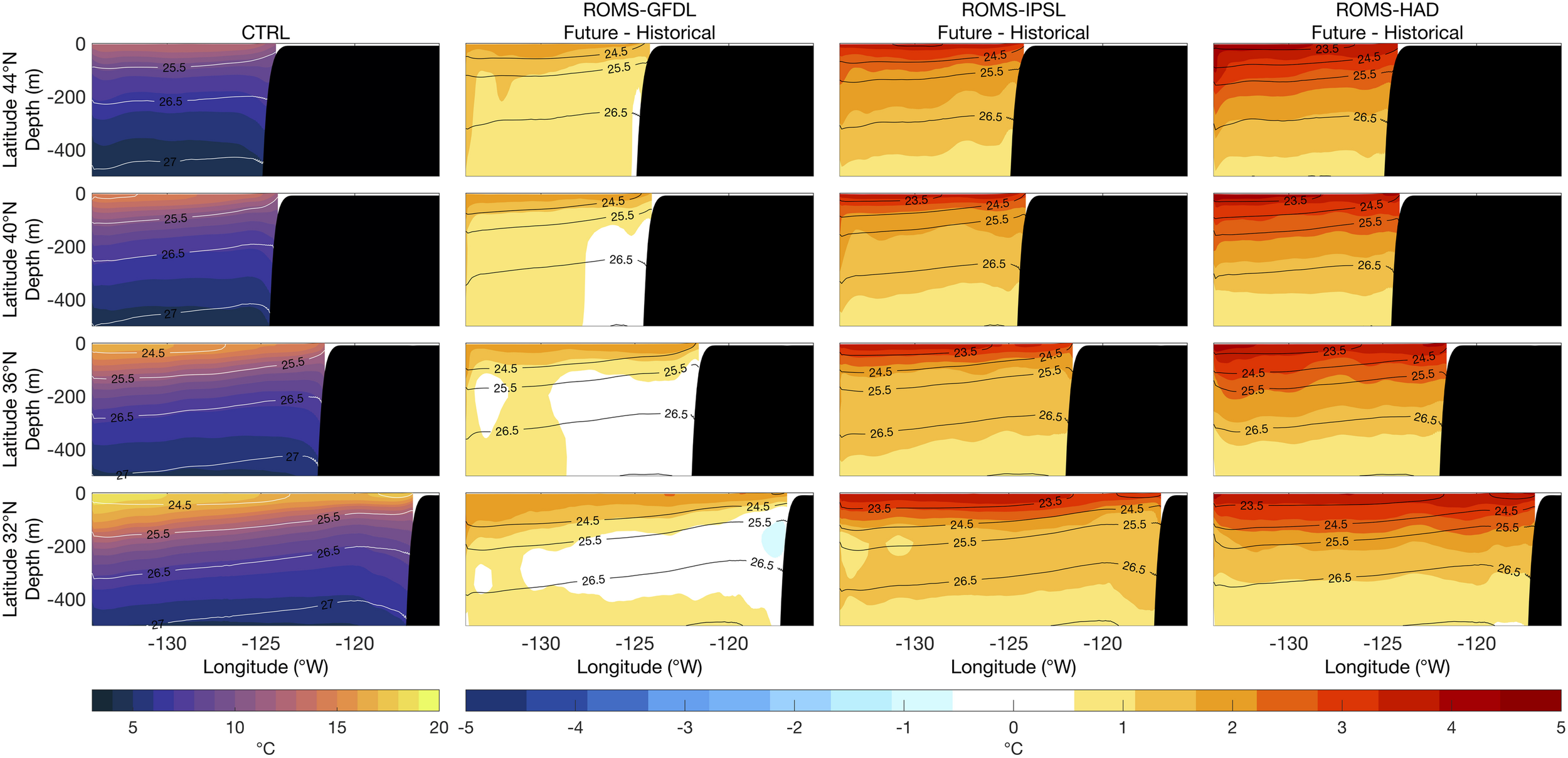 Vertical sections of mean temperature (1980–2010) from the control run (CTRL, first column) and of future temperature changes (2070–2100 relative to historical) from the high-resolution downscaled projections: ROMS-GFDL (second column), ROMS-IPSL (third column), and ROMS-HAD (fourth column). Black contours are potential density (kg m–3) relative to sea surface.