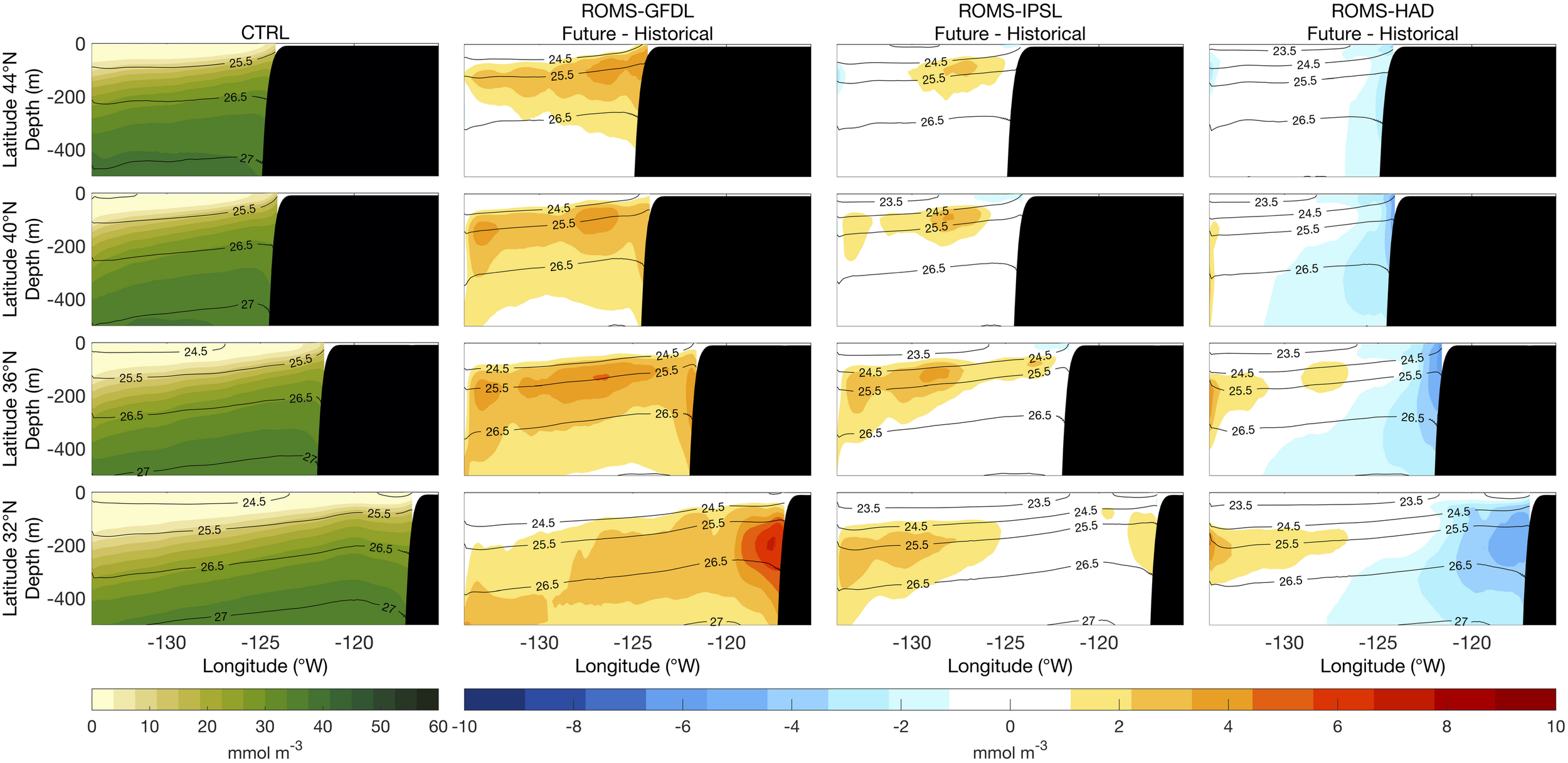 Vertical sections of mean nitrate (1980–2010) from the control run (CTRL, first column) and of future nitrate changes (2070–2100 relative to historical) from the high-resolution downscaled projections: ROMS-GFDL (second column), ROMS-IPSL (third column), and ROMS-HAD (fourth column). Black contours are potential density (kg m–3) relative to sea surface.