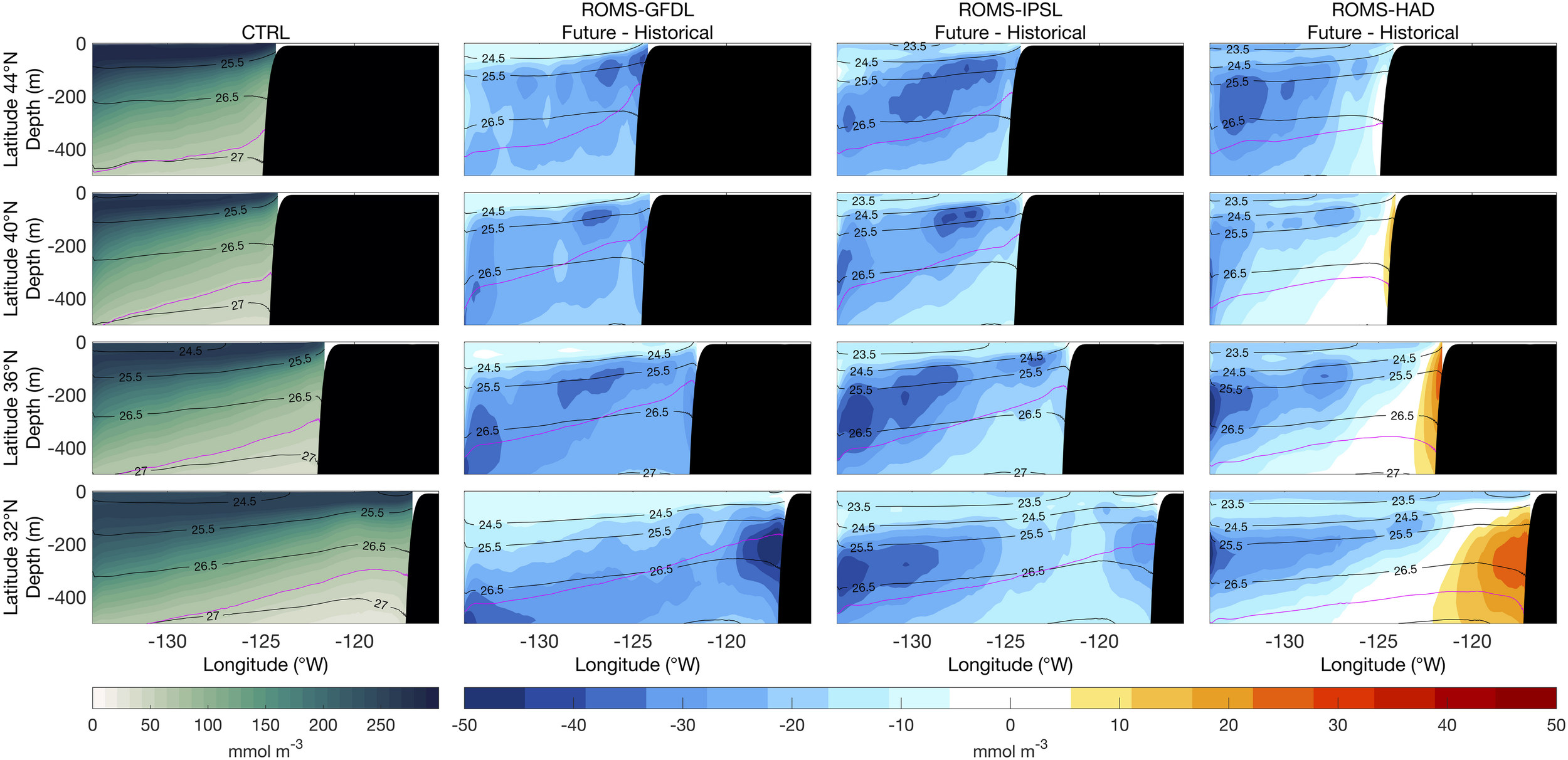 Vertical sections of mean dissolved oxygen (1980–2010) from the control run (CTRL, first column) and of future nitrate changes (2070–2100 relative to historical) from the high-resolution downscaled projections: ROMS-GFDL (second column), ROMS-IPSL (third column), and ROMS-HAD (fourth column). Black contours are potential density (kg m–3) relative to sea surface. Magenta contour corresponds to the hypoxic boundary layer (1.43 ml/l or 63.86 mmol/m3 O2).