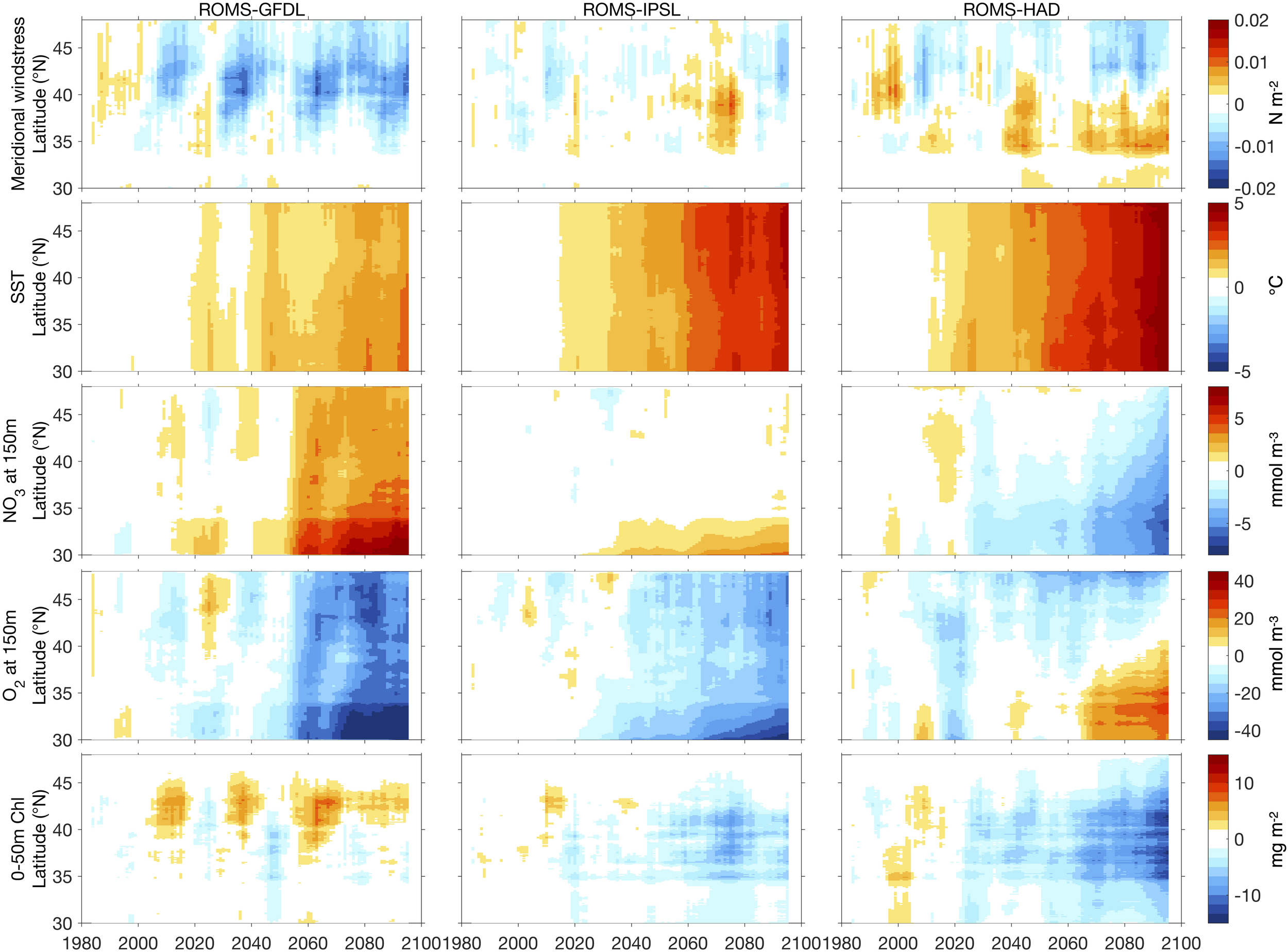Hovmöller diagrams of 10-year running mean annual anomalies averaged from the coast to 100 km offshore of meridional wind stress (top row), SST (second row), nitrate (third row) and dissolved oxygen (fourth row) at 150 and 0–50 m integrated chlorophyll (bottom row) with respect to the historical period (1980–2010), from the high-resolution downscaled projections: ROMS-GFDL (left), ROMS-IPSL (center), and ROMS-HAD (right).