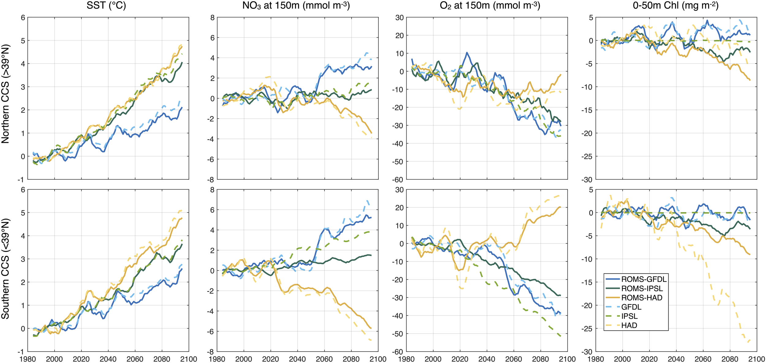 Biogeochemical variables in ROMS-ESMs show different signs in the trends along the CCS coast. These changes and their meridional differences in magnitude are consistent with those from ESMs (Figures 9, 10). In ROMS-GFDL and ROMS-HAD, the evolution of subsurface nitrate and oxygen agree more closely with their ESM counterparts. However, the evolution of these anomalies in ROMS-IPSL separate from those in the IPSL, showing a significant intra-model spread especially in the southern coastal region.