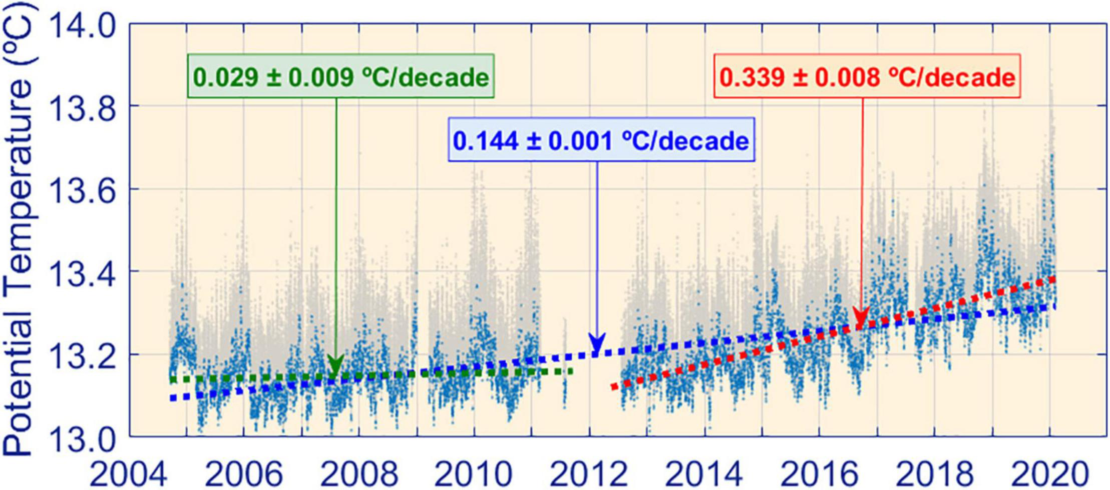 Dashed-blue line in Figure 3 shows a clear trend of 0.144°C/decade in θ (see also Table 1). This value, however, is misleading as the trend during the first half of the record is much less (0.029°C/decade, dashed-green line), whereas it is more than double in the second half (0.339°C/decade, dashed-red line). It seems to be around year 2013 that the trend changed. And it did in an order of magnitude with regards to the before-2012 value! Although this pattern was anticipated in Naranjo et al. (2017), they could not give definitive ratification as they used a correspondingly shorter length of this time series (up to year 2015). The extended series available nowadays does confirm the existence of that trend, which is so large and unexpected that has motivated the present study.