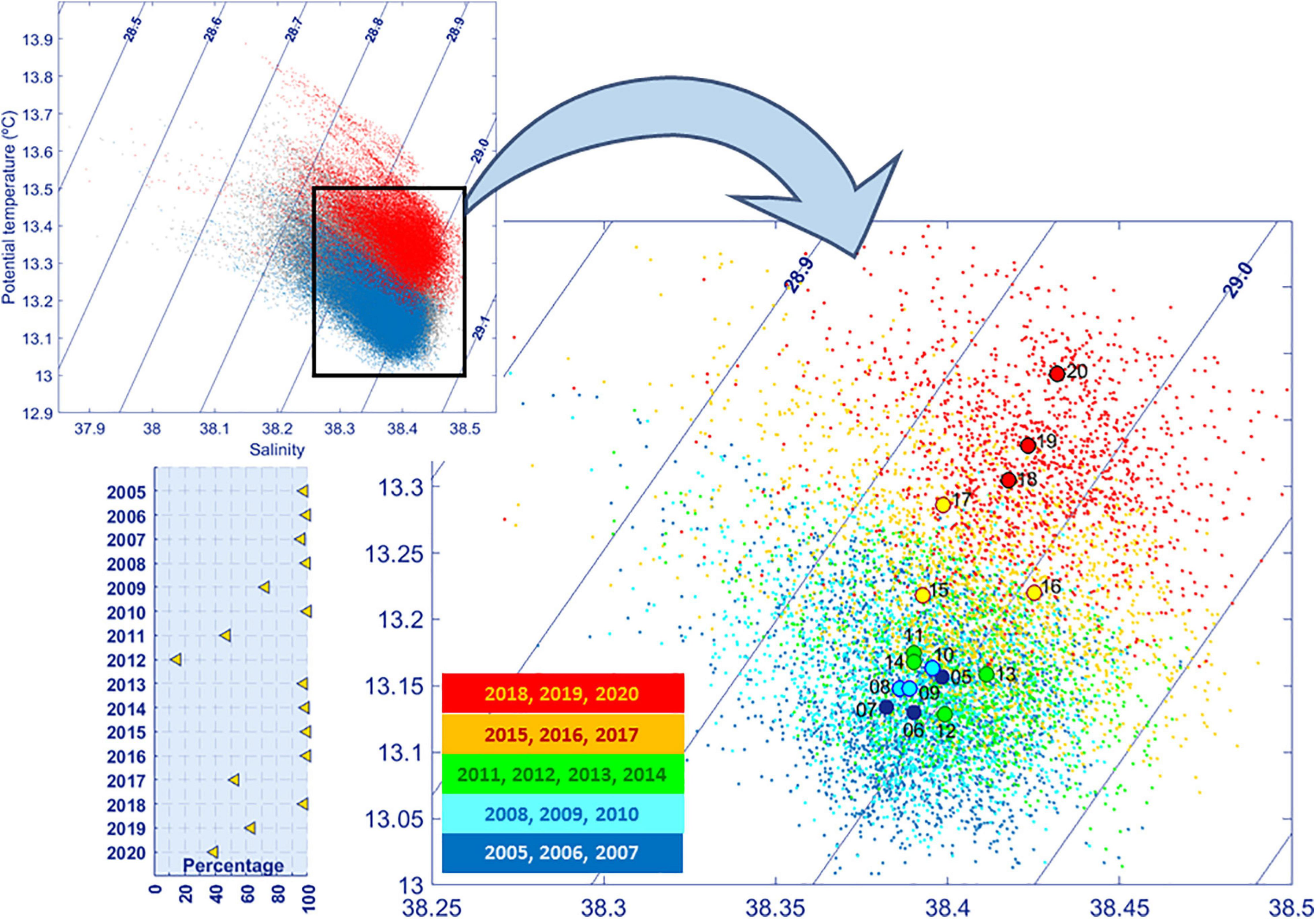 These results are illustrated in the θ-S diagrams of Figure 4. The available data have been grouped together by years. As the monitoring station was first deployed in October 2004, years have been defined from October 1 to September 30 of the following year: year 2005 goes from October 1, 2004 to September 30, 2005 and so on. Light-blue dots in the top-left panel show the data sampled at Δt = 30min during the first three years (2005, 2006, 2007, see legend), and red dots do the same for the last three years (2018, 2019, 2020). The increase of potential temperature of the water flowing past the station is palpable. The rise of salinity and the diminution of density are less obvious but still detectable.