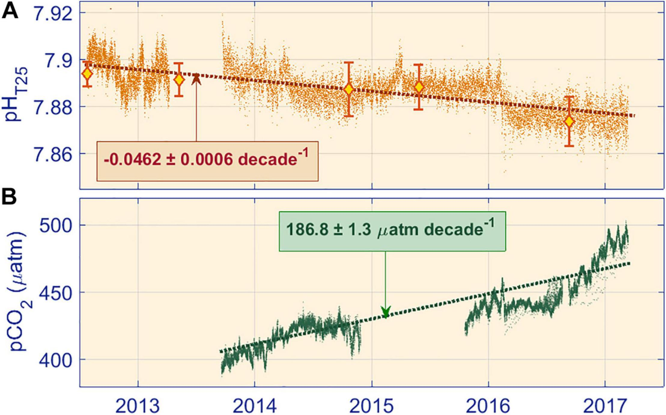 Figure 5B shows complementary in situ pCO2 data from the SAMI sensor, which exhibits a trend inversely and significantly correlated to that of pHT25 (not shown). During the period of available data, the pCO2 in the outflow at the depth of the monitoring station showed a remarkable rise of 186.8 ± 1.3 μatm decade–1. Nevertheless, and in concordance with the pHT25 series, pCO2 evolution did not exhibit a smooth increase but a more evident rise from early 2016.