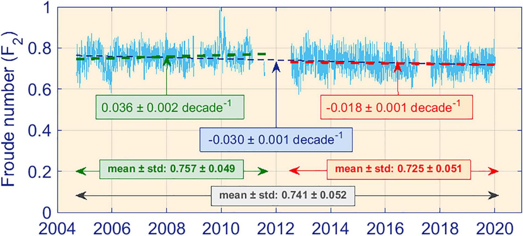 Time evolution of the lower layer Froude number (F2) computed according to equation [4]. Dashed blue line is the linear trend for the whole series and dashed green and red lines show the trends before and after the gap of year 2012, respectively. All numerical values, including 95% confidence levels, are indicated inside the text-boxes with the same color code. Mean and standard deviation for the whole series, and for the first and second parts are also indicated.