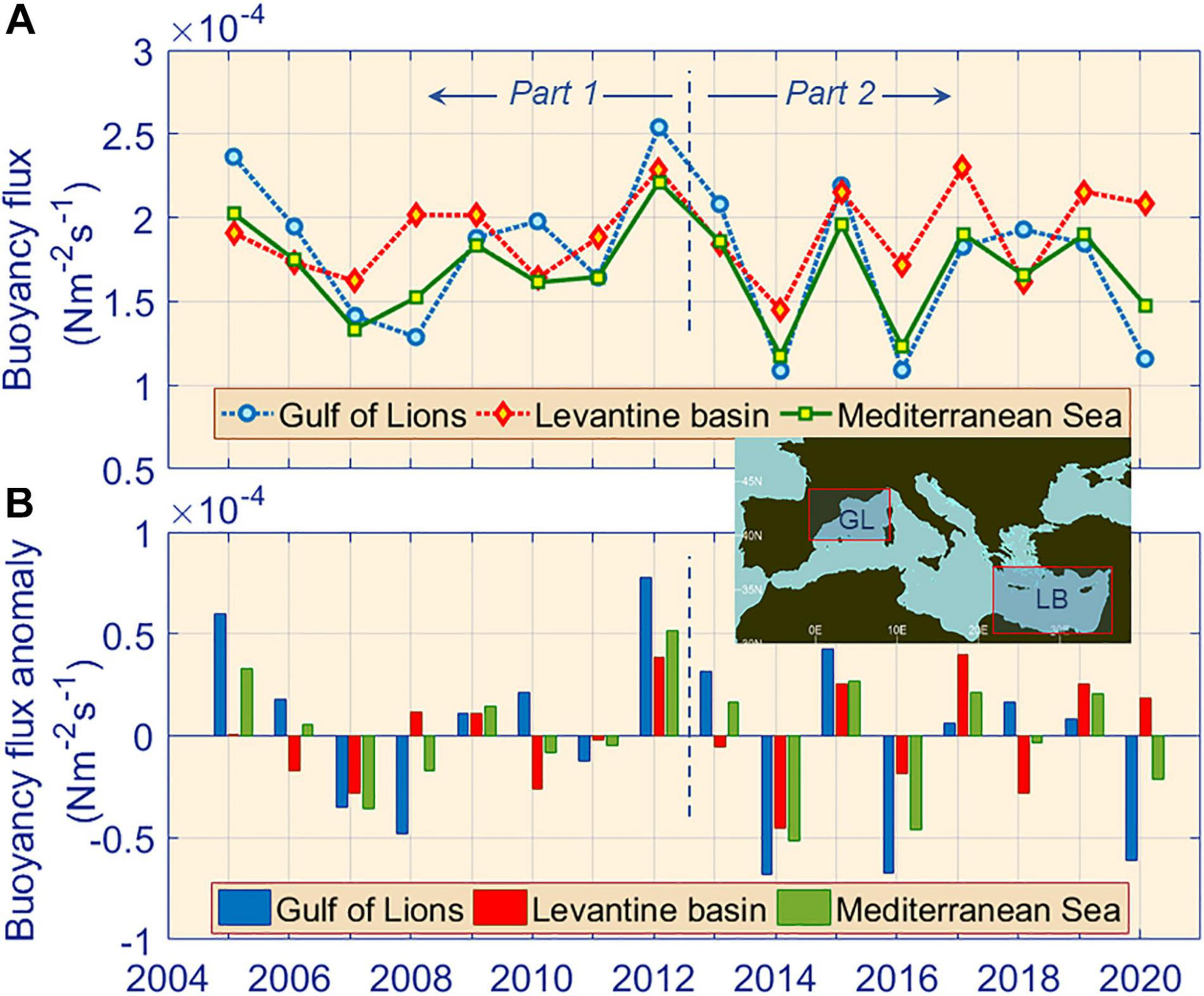 Figure 8A shows the yearly value of B0 averaged during winter months from 2004 to 2020, using the outputs of ERA reanalysis. There is a marked interannual variability with years of strong buoyancy flux, which supposedly correspond to years of large volume of newly formed deep water. It is the case of year 2005 (Schroeder et al., 2008) or years 2009, 2010, 2012 (Houpert et al., 2016) with regards to the WMDW in the western MedSea. But there also exists years of weak buoyancy flux such as 2008 or 2011, when no WMDW was reported to have been formed (Houpert et al., 2016).