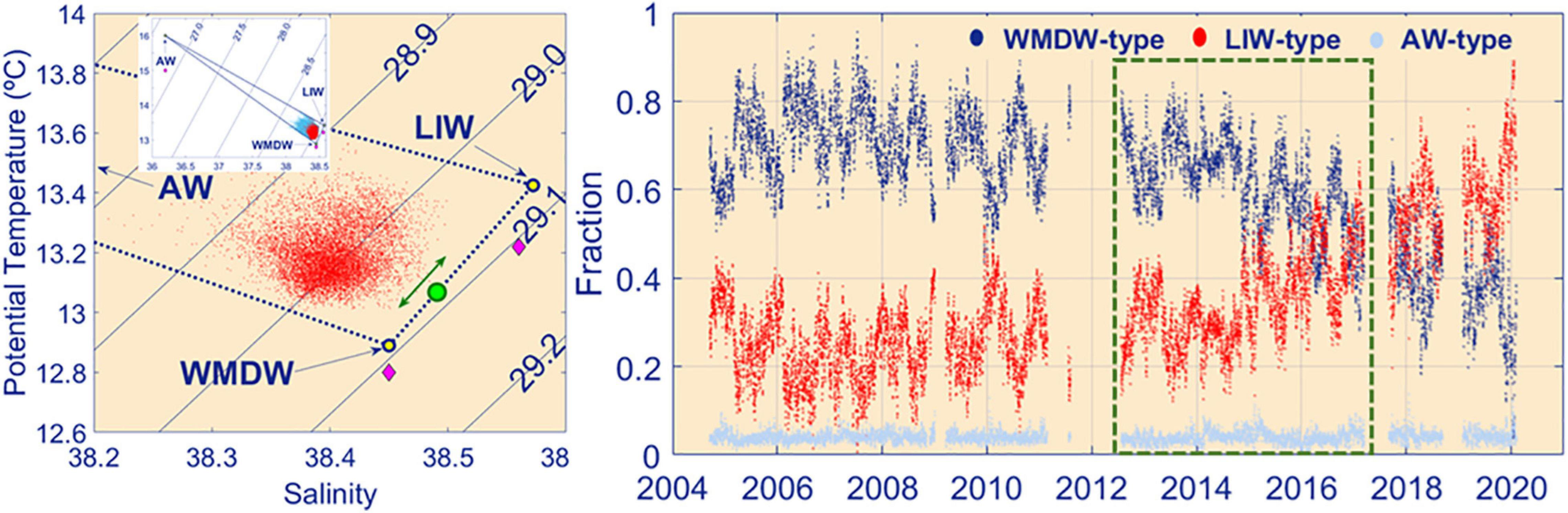 The first hypothesis that the time evolution of water characteristics stems from changes in the fractions of each contributor implicitly assumes that the θ-S characteristics of the triplet remain unchanged. Right panel of Figure 9 shows a sudden increase of LIW-type fraction from year 2015 onwards, along with a corresponding diminution of the WMDW. The fraction of AW was kept essentially unaffected. LIW would become the main contributor in the mixing after year 2017, replacing the prevailing role of WMDW before this year.