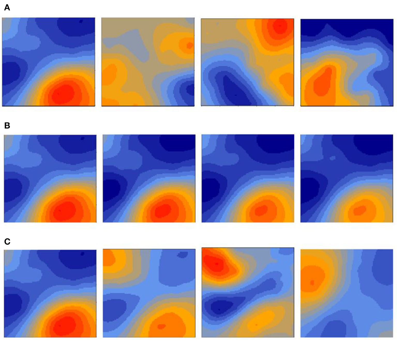 Simulated spatio-temporal scenarios extracted from Paradinas et al. (2017). An opportunistic distribution shows big unrelated changes in the spatial structure among neighboring times. A persistent scenario has very similar spatial structures at every time. A progressive scenario has correlated spatial realization changes over time. (A) Opportunistic distribution. (B) Persistent distribution with trend. (C) Progressive spatio-temporal distribution.