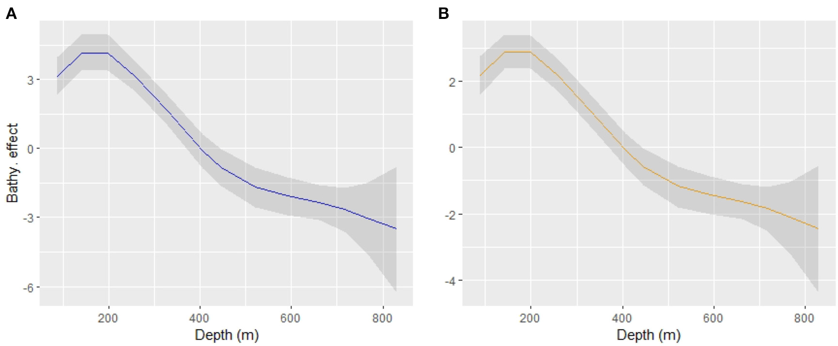 Smoothed bathymetric effect (“RW2”) for the sub-process Binomial (A) and Gamma (B) in the linear predictor scale (logarithmic link).