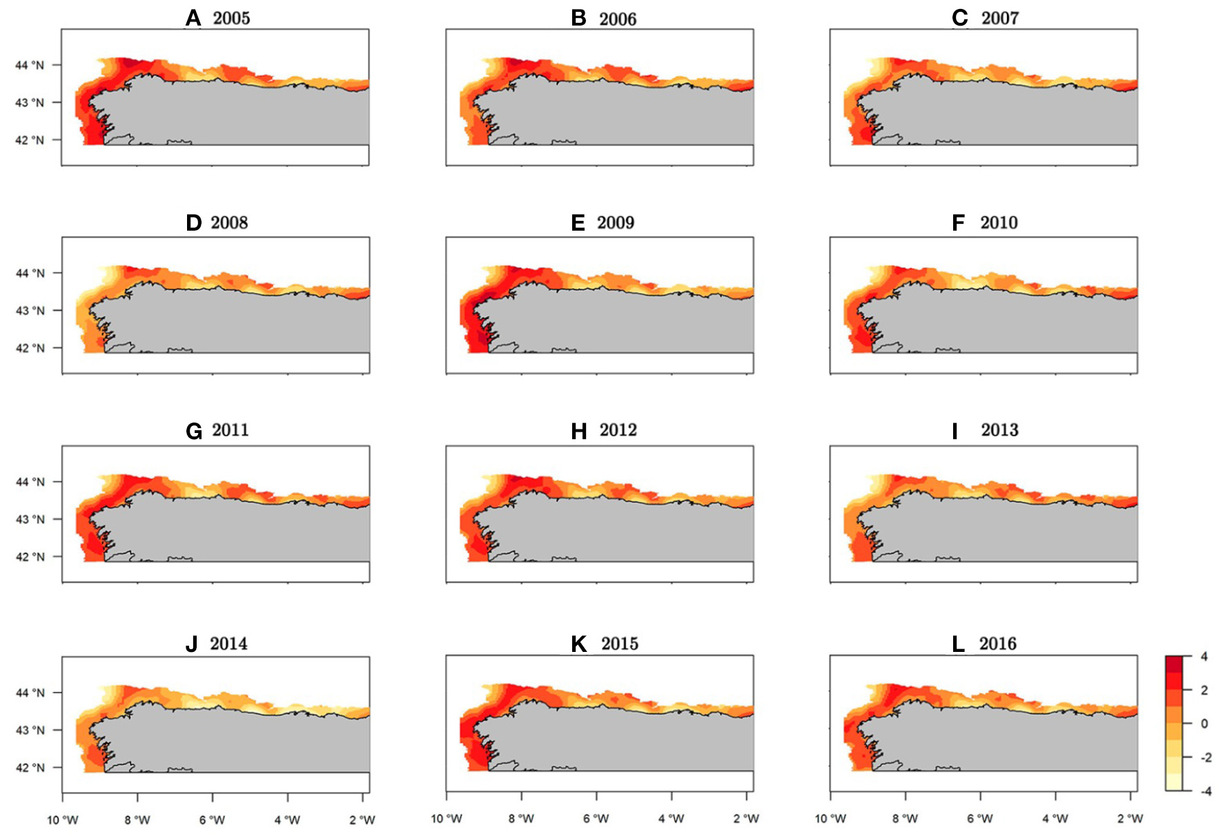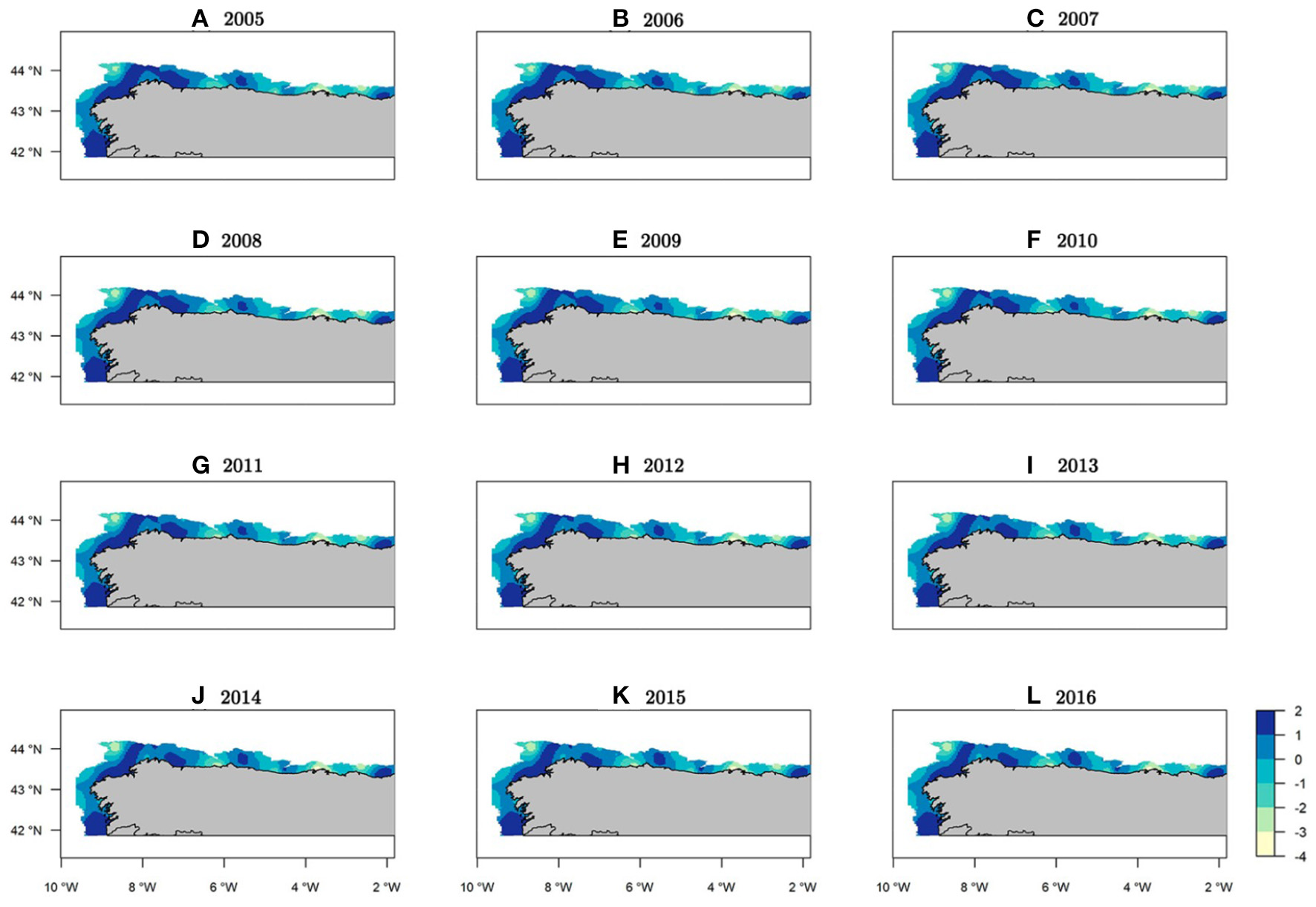 Within the study area, the northwest area of the Iberian Peninsula presented the highest concentration of recruits throughout the entire period (Figure 7). Specifically, from west to east three persistent areas were identified: the area in front of Vigo, the Artabrian gulf (off La Coruña) and La Carretera (Figures 7, 1). Three intermittent areas were identified: one in front of Santander and the other two corresponding to the Bermeo and Guetaria-Fuenterrabía spatial closure areas (Figures 7, 1). The years with the greatest hake recruit abundance were 2005 and 2009, whereas the years with the lowest values were 2008 and 2014 (Supplementary Figure 8).