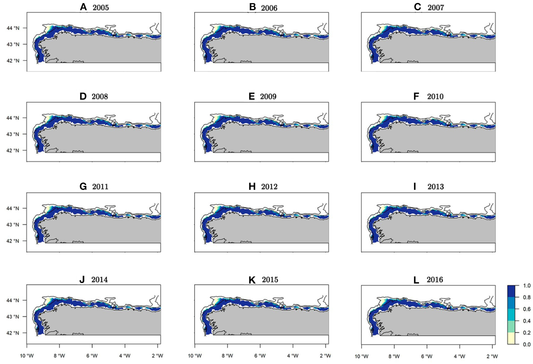 Median occurrence probability maps of the posterior predictive distribution for European hake recruits within the study period. Bathymetric lines correspond to 200 and 800 m isobath.