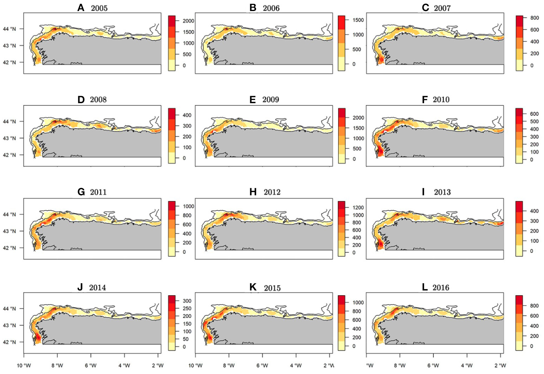 Median abundance (NPUE) maps of the posterior predictive distribution for European hake recruits within the study period. Bathymetric lines correspond to 200 and 800 m isobath. Note each year has it's own scale in order to show where the spatial hotspots are located along the study period.