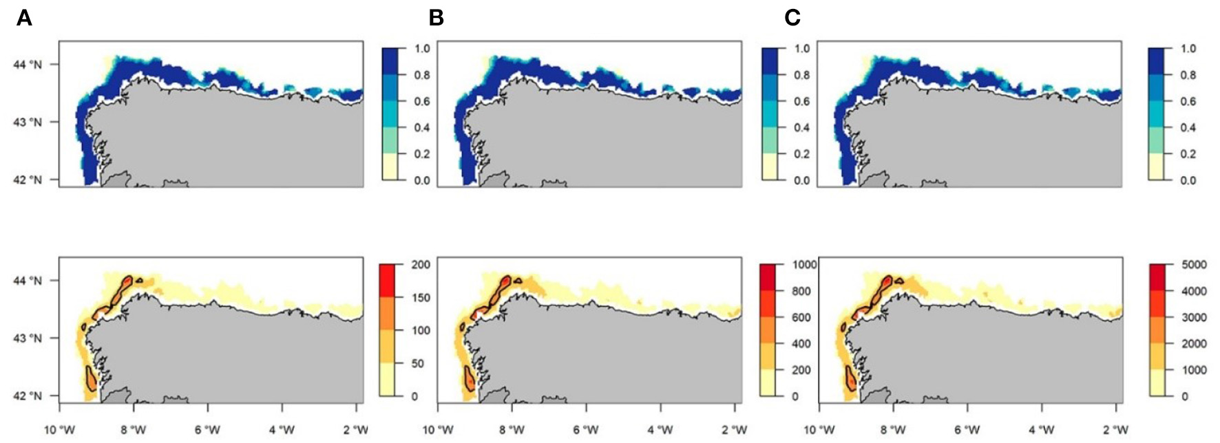 Total mean for all years (2005–2016) correspondent to the first (A), second (B), and third (C) quartiles for occurrence probability (blue) and abundance (orange) of European Hake recruits posterior predictive distribution maps. Contour lines indicates potential nursery areas identified with abundance (NPUE) above the 90th percentile.