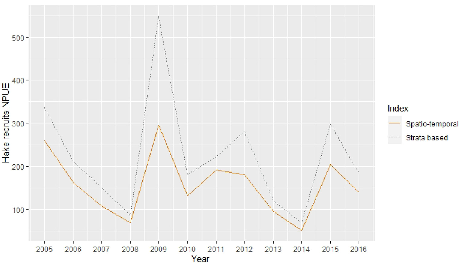 From the final spatio-temporal model output we obtained the mean yearly habitat-based recruits abundance index. For comparison purposes, we created a stock assessment strata-based index for the number of hake recruits (<21 cm), standardized for the area of their corresponding bathymetric strata (from 70 to 500 m) (ICES, 2017).