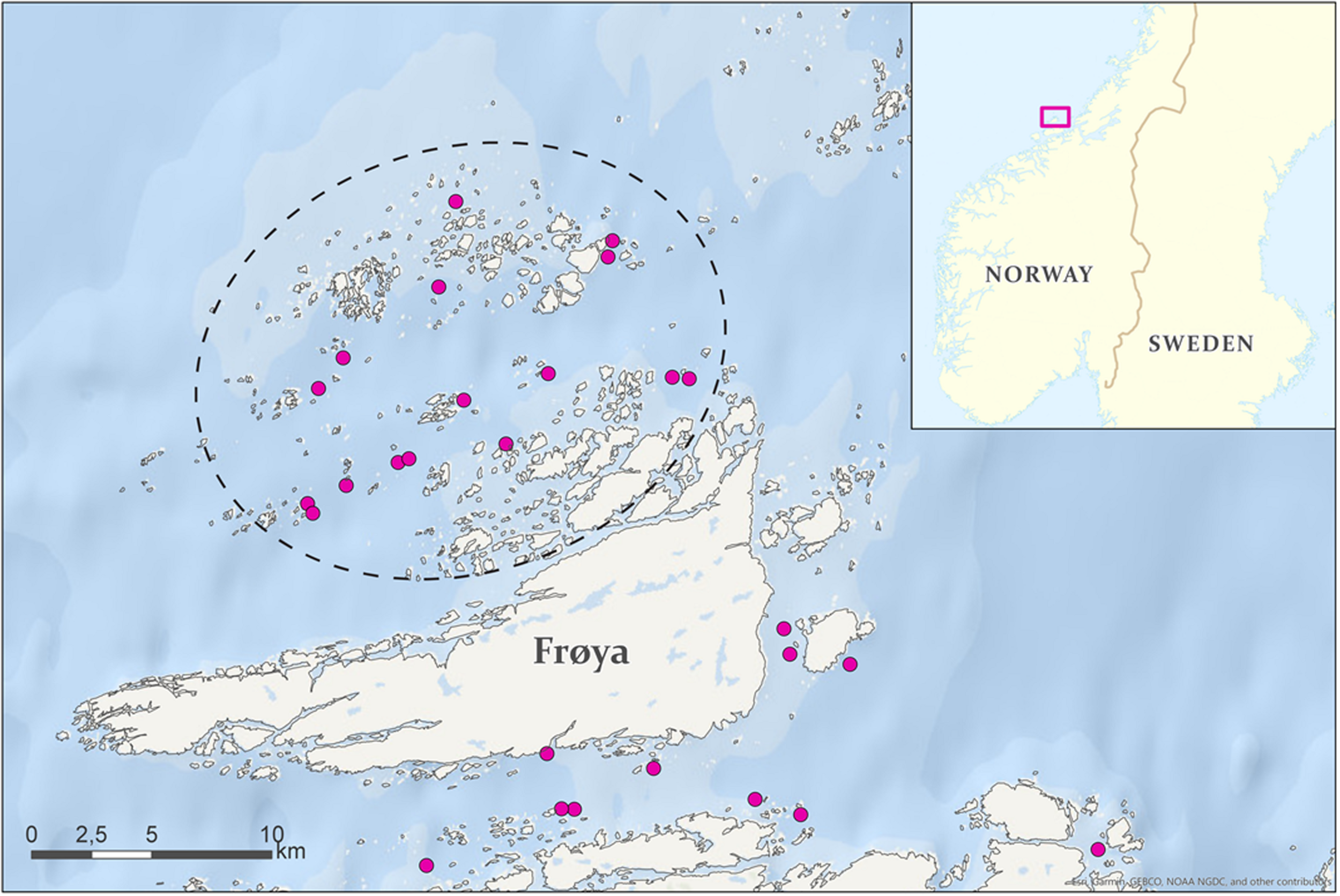 Map over study site (inside black dash circle). Circles indicate salmon farms. Map created by Tale Skrove.© Kartverket© Europa wms.