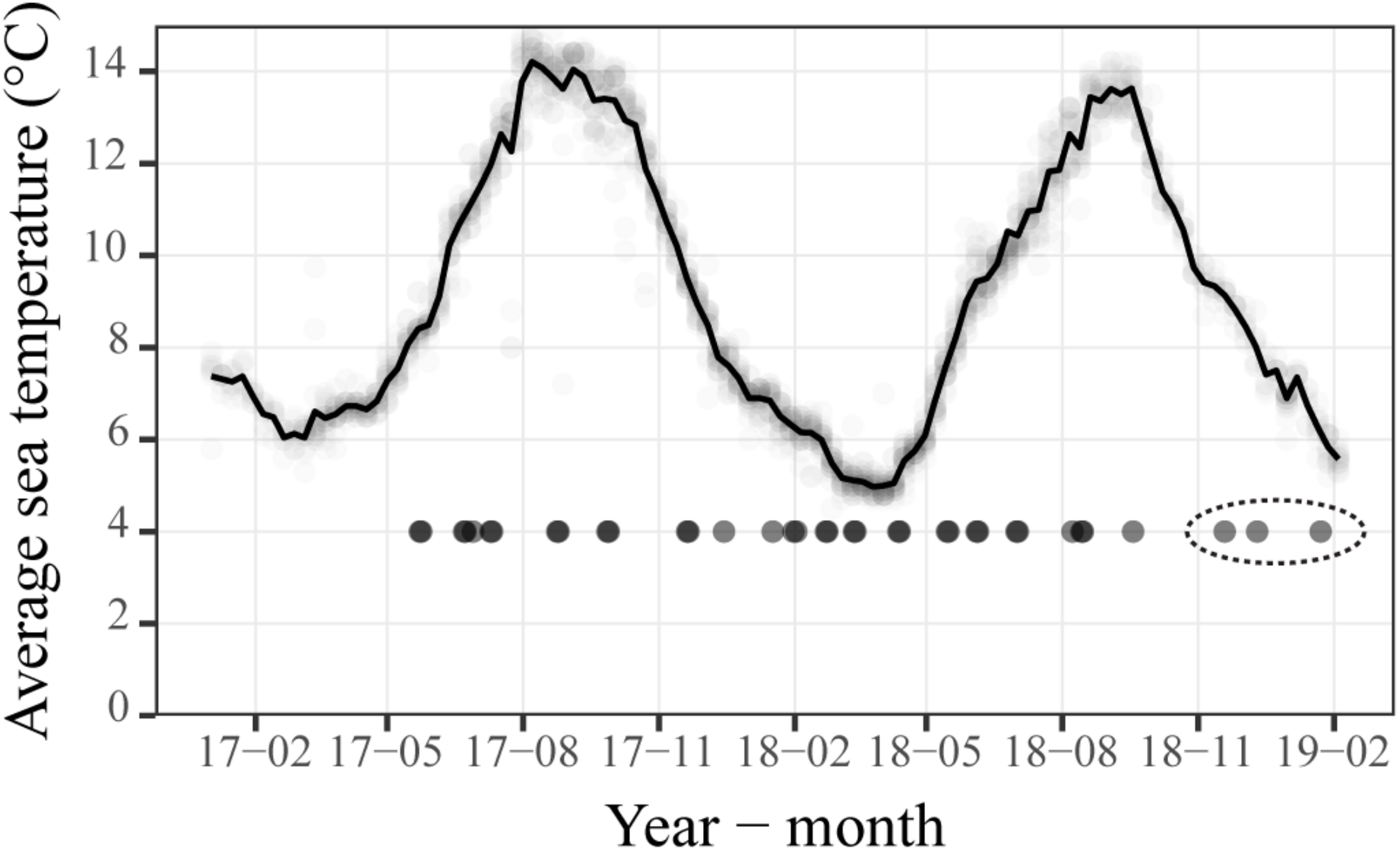 Average sea temperature (at 3 m depth) for the Island Frøya. Temperature measurements for each salmon farm, downloaded from BarentsWatch, are shown by faint circles around the line. Days when planktonic sea lice were sampled are shown as black circles (at y = 4), and the dashed ellipse indicates samples taken during the fallowing period.