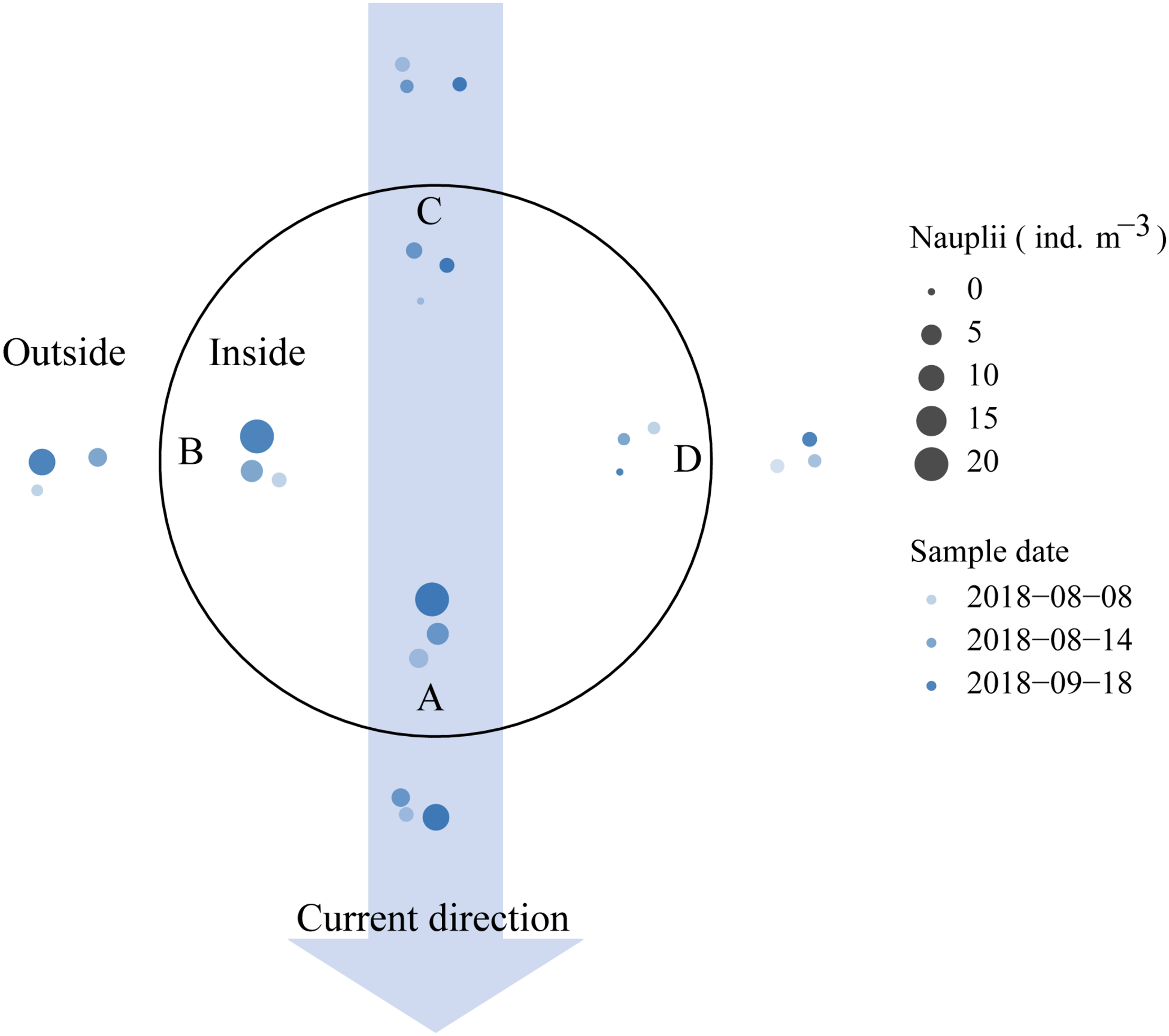 Comparison of sea lice densities obtained at different sampling points. Arrow indicates surface current. Circles indicate where samples were taken inside and outside of the sea cage (blue circles) at sample points A to D on three sample days (variable colors). Size of colored circles indicates planktonic lice per m–3 found at each sample point and time (scale shown by black circles in legend).