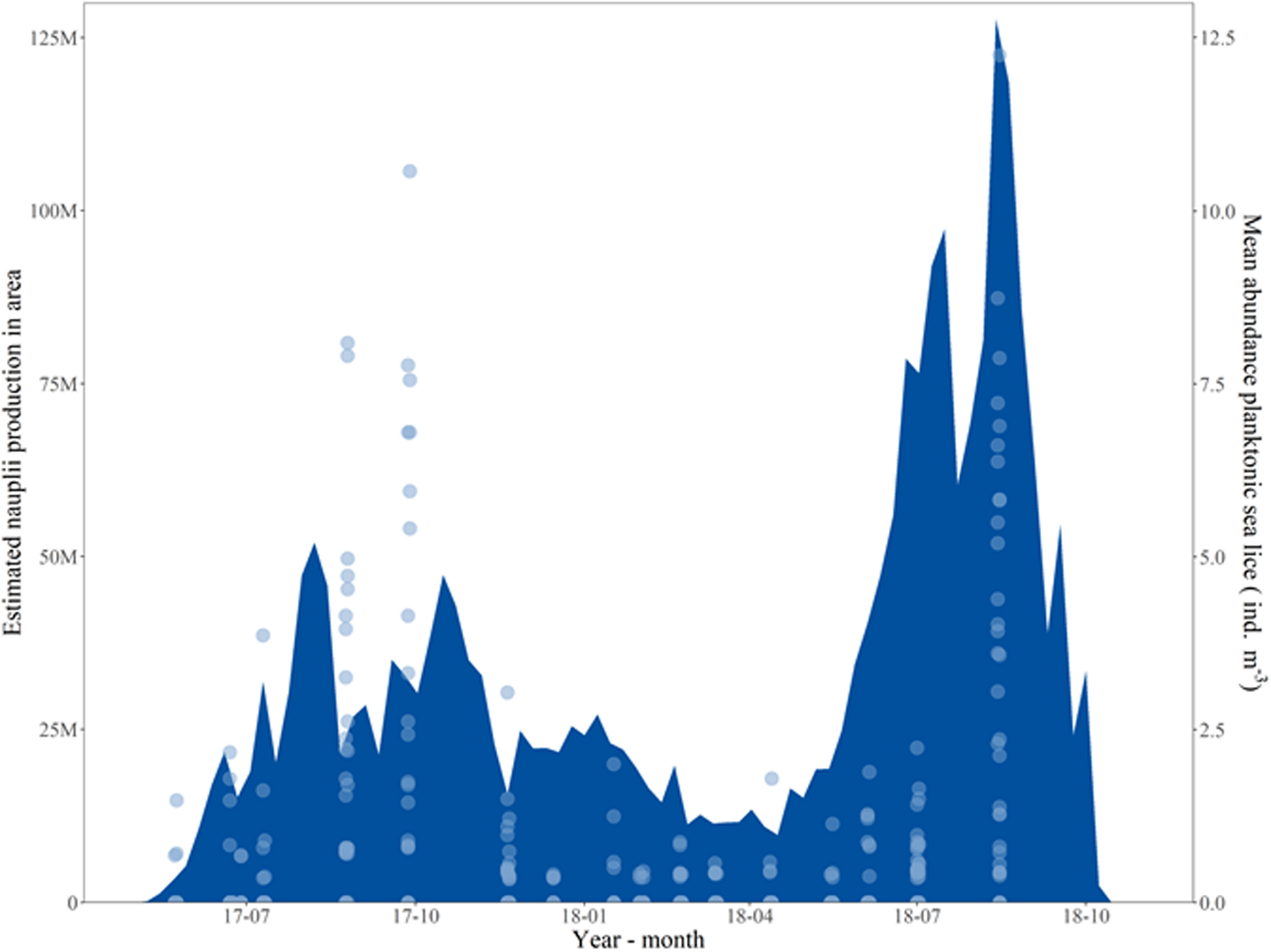 Further expansion in salmon aquaculture is dependent on the combined impact of all farms in the area. There is a continuous effort to ensure that the models supporting the decisions of the “traffic light system” are correct (Sandvik et al., 2020). The models have been evaluated by comparing predictions with observations of mean abundance of salmon lice on salmon smolts kept in sentinel cages (Sandvik et al., 2016). The reason given for comparing the models with indirect measurements of salmon lice larvae densities, such as salmon lice on salmon smolts in sentinel cages, instead of with direct measurements of densities of the salmon lice larvae in the water masses is that direct measurements of copepodites in the water masses are scarce and hard to come by. Therefore, there is uncertainty about the relationship between the abundance of adult salmon lice on farmed salmon and the densities and distribution of planktonic salmon lice in the water masses.